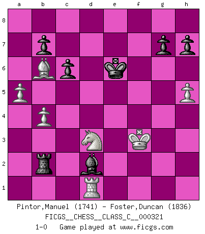 Last move : 1-0 2024 June 27 16:39:22 [Event "FICGS__CHESS__CLASS_C__000321"] [Site "FICGS"] [Date "2024.04.11"] [Round "1"] [White "Pintor,Manuel"] [Black "Foster,Duncan"] [Result "1-0"] [WhiteElo "1741"] [BlackElo "1836"] 1.e4 d5 2.exd5 Qxd5 3.Nc3 Qd6 4.d4 Nf6 5.f4 Nc6 6.Nf3 Bg4 7.d5 Nb4 8.Bc4 O-O-O 9.Be3 Kb8 10.O-O Nbxd5 11.Nxd5 Nxd5 12.Bxd5 Qxd5 13.Qxd5 Rxd5 14.Ne5 Bh5 15.g4 f6 16.Rad1 Rxd1 17.Rxd1 c6 18.Nd7+ Kc7 19.gxh5 e5 20.fxe5 fxe5 21.Nxe5 Bd6 22.Nf7 Re8 23.Bxa7 Bf4 24.Bf2 Re2 25.a4 Rxc2 26.b4 Bxh2+ 27.Kg2 Bf4 28.a5 Rb2 29.Kf3 Bd2 30.Bb6+ Kd7 31.Ne5+ Ke6 32.Nd3 1-0 Follow this game move after move (download)Fischer sacrificed virtually everything most of us weakies (to use his term) value, respect, and cherish, for the sake of an artful, often beautiful board game, for the ambivalent privilege of being its greatest master. (Paul Kollar) Im Reiche der Wirklichkeit ist man nie so glücklich wie im Reiche der Gedanken. (Arthur Schopenhauer) Ayuda a tus piezas para que ellas te puedan ayudar. (Paul Morphy) La vérité est comme le meilleur coup aux échecs : elle existe, mais il faut la chercher. (Arturo Perez-Reverte) The weakness of an artist is dogma. (Josh Waitzkin)