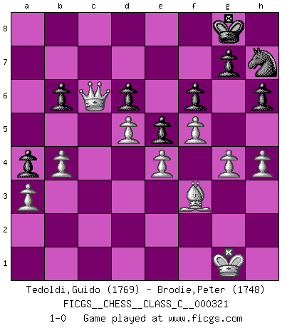 Last move : 1-0 2025 February 3 15:51:19 [Event "FICGS__CHESS__CLASS_C__000321"] [Site "FICGS"] [Date "2024.04.11"] [Round "1"] [White "Tedoldi,Guido"] [Black "Brodie,Peter"] [Result "1-0"] [WhiteElo "1769"] [BlackElo "1748"] 1.c4 c5 2.Nc3 Nc6 3.d3 Nf6 4.e4 e5 5.Nf3 d6 6.h3 Be7 7.Be2 O-O 8.O-O b6 9.Bg5 Be6 10.a3 h6 11.Bh4 Nh7 12.Bxe7 Qxe7 13.Rc1 Nf6 14.Nd5 Qd8 15.Qd2 Rc8 16.Nh2 Bxd5 17.cxd5 Nd4 18.Rc3 a5 19.f4 Qe7 20.f5 Nh7 21.Bg4 Nf6 22.Bd1 c4 23.Nf3 Nxf3+ 24.Bxf3 a4 25.dxc4 Rc5 26.Qe2 Rfc8 27.Rb1 Qc7 28.Rbc1 Nh7 29.h4 Nf6 30.g4 Nh7 31.b4 Rxc4 32.Rxc4 Qxc4 33.Rxc4 Rxc4 34.Qxc4 f6 35.Qc6 1-0 Follow this game move after move (download)You know you're going to lose. Even when I was ahead I knew I was going to lose. - On playing against Fischer. (Andrew Soltis) Privat ist Kortschnoi kein schlechter Mensch, sehr sympathisch. Aber während des Spiels ist er grausam. Er will dich töten. (Miguel Najdorf) ¡Examina movidas que hagan daño! Un buen ojo for movidas desvastantes es mucho mas importante que el conocimiento de principios estratégicos. (Purdy) Aux échecs, l'amour-propre est satisfait quand on remporte la victoire, mais il n'y a pas de honte à être battu. (Benjamin Franklin) Every vice is only an exaggeration of a necessary and virtuous function. (Ralph Waldo Emerson, Journals 1936)