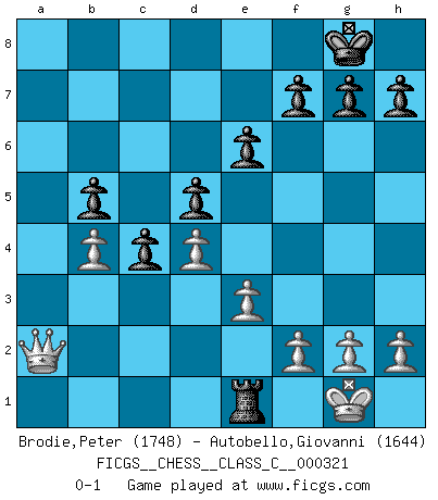 Last move : 0-1 2024 November 1 18:22:37 [Event "FICGS__CHESS__CLASS_C__000321"] [Site "FICGS"] [Date "2024.04.11"] [Round "1"] [White "Brodie,Peter"] [Black "Autobello,Giovanni"] [Result "0-1"] [WhiteElo "1748"] [BlackElo "1644"] 1.Nf3 Nf6 2.Nc3 d5 3.d4 Bf5 4.e3 e6 5.Be2 Bd6 6.O-O O-O 7.Bd3 Bxd3 8.Qxd3 c5 9.Bd2 Nc6 10.a3 c4 11.Qe2 a6 12.b3 b5 13.b4 Qb6 14.Rad1 a5 15.Na2 axb4 16.Bxb4 Nxb4 17.Nxb4 Rxa3 18.Rb1 Ne4 19.Qe1 Rfa8 20.Qe2 Nc3 21.Qd2 Nxb1 22.Rxb1 Ra1 23.Rxa1 Rxa1+ 24.Ne1 Qa5 25.c3 Bxb4 26.cxb4 Qa2 27.Qxa2 Rxe1+ 0-1 Follow this game move after move (download)The essence of Chess is thinking about what Chess is. (David Bronstein) Das ganze Leben mit einer Ehefrau ist wie ein Endspiel mit ungleichfarbigen Läufern. (Viktor Kortschnoi) Un juego de Ajedrez es un dialogo, una conversación entre un jugador y su oponente. Cada movimiento del oponente puede contener amenazas o tropiezos, pero un jugador no se puede defender de las amenazas o tomar ventaja de los tropiezos si es que no se pregunta a sí mismo: ¿Que es lo que mi oponente va a hacer después de cada movida?. (Bruce A. Moon) Les réformistes prétendent que les progrès de la théorie conduiront à la disparition des échecs, et qu'il faut, pour leur rendre vie, en remanier les règles. En réalité, qu'exprime cette affirmation? Le mépris de l'intuition, de l'imagination et de tous les autres éléments qui font des échecs un art. (Alexander Alekhine) Luck is when opportunity knocks and you answer. (Anonymous)