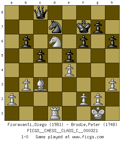 Last move : 1-0 2025 January 24 19:36:33 [Event "FICGS__CHESS__CLASS_C__000321"] [Site "FICGS"] [Date "2024.04.11"] [Round "1"] [White "Fioravanti,Diego"] [Black "Brodie,Peter"] [Result "1-0"] [WhiteElo "1981"] [BlackElo "1748"] 1.e4 e6 2.d3 d5 3.Nd2 Bb4 4.c3 Be7 5.Ngf3 dxe4 6.dxe4 Nc6 7.Bb5 Bd7 8.O-O Nf6 9.Re1 O-O 10.Nb3 a6 11.Bf1 e5 12.h3 h6 13.Qc2 Be6 14.Be3 Bd6 15.Nc5 Bxc5 16.Bxc5 Re8 17.Rad1 Qc8 18.b3 a5 19.Rd2 b6 20.Bb5 Bd7 21.Ba3 Nb4 22.cxb4 axb4 23.Bxd7 Nxd7 24.Bxb4 c5 25.Bc3 f6 26.Red1 Re7 27.Rd6 Ra7 28.Nh4 Rf7 29.Nf5 Rc7 30.Qe2 Rc6 31.Qc4 Rxd6 32.Qxf7+ Kxf7 33.Nxd6+ 1-0 Follow this game move after move (download)Chess is not like life... it has rules ! (Mark Pasternak) Ich habe die Schachforschung dermaßen betrieben, dass sie auf eine wissenschaftliche Basis gestellt wurde. (Mikhail Moiseyevich Botvinik) Cuando tu casa esta en llamas, no puedes ser molestado por tus vecinos. O, como decinos en Ajedrez, si tu Rey esta bajo ataque, no te preocupa perder un Peón del lado de la Reina. (Gary Kasparov) Des idées, des idées, j'en ai cent, j'en ai mille. Des bonnes, des mauvaises, applicables, irréalisables... Il suffit de faire le tri ! (Roos) Plans are ideas that never come to fruition. (Daniel Parmet)