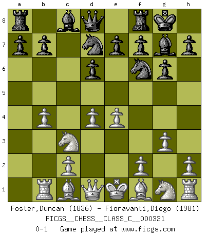 Last move : 0-1 2024 June 14 0:13:17 [Event "FICGS__CHESS__CLASS_C__000321"] [Site "FICGS"] [Date "2024.04.11"] [Round "1"] [White "Foster,Duncan"] [Black "Fioravanti,Diego"] [Result "0-1"] [WhiteElo "1836"] [BlackElo "1981"] 1.e4 c5 2.a3 g6 3.b4 cxb4 4.axb4 Bg7 5.Nc3 d6 6.g3 Nf6 7.Rb1 O-O 8.d4 Nbd7 0-1 This chess game has been lost on time (started : 2024.04.11 18:3:15) Follow this game move after move (download)Many have become Chess Masters, no one has become the Master of Chess. (Siegbert Tarrasch) Pläne sind die Träume des Verständigen. (Ernst Freiherr von Feuchtersleben) Yo tuve un dolor de muelas en la primer partida. En el segundo juego, tuve un dolor de cabeza. En el tercero, tuve un ataque de reumatísmo. En la cuarta partida, no me sentía muy bien. ¿Y en el quinto juego? Bueno, ¿que acaso uno tiene que ganar todos los juegos?. (Siegbert Tarrasch) D'abord les bases : Jouez et étudiez, puis étudiez et jouez, ensuite jouez et étudiez, puis étudiez et jouez. Deuxièmement : Donnez toujours le meilleur de vous-même ! (Ken Smith) Methinks King Thibault should dub Marius Zubac a knight of the square board... I mean table, henceforth addressing him as Sir Marius, and bestow on him a suitable land from the kingdom of FICGS & marry him off to a worthy, fair maiden, lest he slice our heads with his mighty sword in his wrath. (Dinesh De Silva)