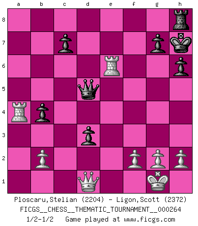 Last move : 1/2-1/2 2024 May 10 15:50:51 [Event "FICGS__CHESS__THEMATIC_TOURNAMENT__000264"] [Site "FICGS"] [Date "2024.04.17"] [Round "1"] [White "Ploscaru,Stelian"] [Black "Ligon,Scott"] [Result "1/2-1/2"] [WhiteElo "2204"] [BlackElo "2372"] 1.e4 e5 2.Nf3 Nc6 3.Bc4 Nf6 4.Ng5 d5 5.exd5 Nxd5 6.d4 Nxd4 7.c3 b5 8.Bd3 h6 9.Nxf7 Kxf7 10.cxd4 exd4 11.O-O Rb8 12.a4 Nb4 13.Be4 bxa4 14.Nd2 Bd6 15.Qh5+ Kg8 16.Rxa4 Be6 17.Re1 a6 18.Bg6 Qd7 19.Ra5 Rf8 20.Qd1 Rf6 21.Bb1 d3 22.Ne4 Rf5 23.Ra4 a5 24.Nxd6 Qxd6 25.Bd2 Rd5 26.Bxb4 axb4 27.Ba2 Kh7 28.Bxd5 Qxd5 29.Rxe6 1/2-1/2 Follow this game move after move (download)If I win a tournament, I win it by myself. I do the playing. Nobody helps me. (Bobby Fischer) Die meiste Zeit treffe ich auf Gegner, die meine Enkel sein könnten. Ich bin da, um ihnen zu zeigen, dass sie von mir noch einiges lernen können. (Viktor Kortschnoi) Vive, pierde y aprende al observar a tu oponente como ganar. (Amber Steenbock) Il vaut mieux sacrifier les pièces de l'adversaire. (Xavier Tartacover) I fear not the man who has practiced 10,000 kicks once, but I fear the man who has practiced one kick 10,000 times. (Bruce Lee)