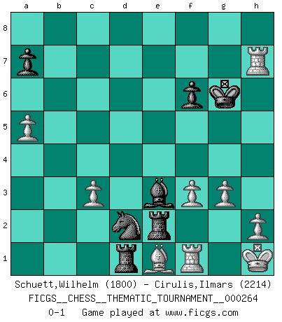 Last move : 0-1 2024 November 15 21:24:49 [Event "FICGS__CHESS__THEMATIC_TOURNAMENT__000264"] [Site "FICGS"] [Date "2024.04.17"] [Round "1"] [White "Schuett,Wilhelm"] [Black "Cirulis,Ilmars"] [Result "0-1"] [WhiteElo "1800"] [BlackElo "2214"] 1.e4 e5 2.Nf3 Nc6 3.Bc4 Nf6 4.Ng5 d5 5.exd5 Nxd5 6.Nxf7 Kxf7 7.Qf3+ Ke6 8.Nc3 Ncb4 9.O-O c6 10.d4 Qf6 11.Qe2 Ke7 12.dxe5 Qg6 13.Ne4 Bf5 14.f3 Ke8 15.c3 Na6 16.Bxa6 bxa6 17.Qxa6 Bc8 18.Nf6+ Qxf6 19.Qxc8+ Rxc8 20.exf6 Bc5+ 21.Kh1 gxf6 22.Bd2 Kf7 23.Rad1 Rcd8 24.g3 Rhe8 25.b4 Be3 26.Be1 Nb6 27.Rb1 h5 28.Kg2 Nc4 29.a4 Bb6 30.a5 Re2+ 31.Kh1 Be3 32.b5 cxb5 33.Rxb5 Rd1 34.Rxh5 Nd2 35.Rh7+ Kg6 0-1 Follow this game move after move (download)Not only will I predict his triumph over Botvinnik, but I'll go further and say that he'll probably be the greatest Chess player that ever lived. (John Collins) Es genügt nicht ein guter Spieler zu sein, man muß auch gut spielen. (Siegbert Tarrasch) La mitad de las variaciones que son calculadas en una partida de torneo, resultan ser completamente superfluas. Desafortunadamente, nadie sabe por adelantado cual mitad. (Jan Tinman) Aux échecs, l'amour-propre est satisfait quand on remporte la victoire, mais il n'y a pas de honte à être battu. (Benjamin Franklin) Tree pose grows confidence. It roots me to this world. (Terri Guillemets)