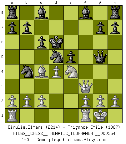 Last move : 1-0 2024 April 25 8:51:51 [Event "FICGS__CHESS__THEMATIC_TOURNAMENT__000264"] [Site "FICGS"] [Date "2024.04.17"] [Round "1"] [White "Cirulis,Ilmars"] [Black "Trigance,Emile"] [Result "1-0"] [WhiteElo "2214"] [BlackElo "1867"] 1.e4 e5 2.Nf3 Nc6 3.Bc4 Nf6 4.Ng5 d5 5.exd5 Nxd5 6.Nxf7 Kxf7 7.Qf3+ Ke6 8.Nc3 Ncb4 9.O-O c6 10.d4 Kd6 11.Bg5 Qxg5 12.Ne4+ 1-0 Follow this game move after move (download)Help your pieces so they can help you. (Paul Morphy) Im Blitz ist es einfacher mit einer Figur weniger anzugreifen, als sich mit einer Mehrfigur zu verteidigen. (Mikhail Nekhemyevich Tal) Mi estilo es algo parecido entre un poco de Tal y Petrosian. (Reshevsky) Il n'y a pas eu de défaite parce que je ne crois pas que cet ordinateur ait jamais existé. IBM a triché en refusant d'imprimer les modes de recherche de la machine. C'est évident, pendant le match, des coups décisifs ont été joués par des êtres humains. Aujourd'hui, les meilleurs spécialistes en informatique ne peuvent toujours pas expliquer comment Deep-Blue a pu jouer contre la logique des ordinateurs. IBM a gagné une guerre de communication, mais ils sont incapables de prouver que l'ordinateur a gagné tout seul. (Garry Kasparov) The Movers & Shakers of this world are those who play chess in the mornings and go to the disco in the evenings. (Dinesh De Silva)