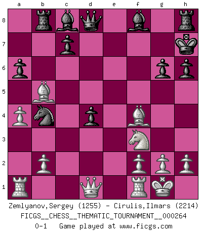 Last move : 0-1 2024 June 25 0:24:33 [Event "FICGS__CHESS__THEMATIC_TOURNAMENT__000264"] [Site "FICGS"] [Date "2024.04.17"] [Round "1"] [White "Zemlyanov,Sergey"] [Black "Cirulis,Ilmars"] [Result "0-1"] [WhiteElo "1255"] [BlackElo "2214"] 1.e4 e5 2.Nf3 Nc6 3.Bc4 Nf6 4.Ng5 d5 5.exd5 Nxd5 6.d4 Nxd4 7.c3 b5 8.Bd3 h6 9.Nxf7 Kxf7 10.cxd4 exd4 11.O-O Rb8 12.a4 Nb4 13.Bxb5 Kg6 14.Nd2 Kh7 15.Nf3 g6 16.Bf4 a6 0-1 Follow this game move after move (download)Play the opening like a book, the middle game like a magician, and the endgame like a machine. (Spielmann) Die Partien sind immer verschieden, die Interviews immer die gleichen. (Garry Kasparov) El Ajedrez no es una pizca de inferior al violín, y tenemos un gran número de violinistas profesionales. (Mikhail Botvinnik) Les ravages du H expliquent la différence de niveau entre Tal et Thal [Abergel]. I find your interest interesting. (Gregory House, House M.D.)