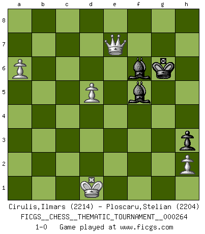 Last move : 1-0 2024 June 5 13:25:56 [Event "FICGS__CHESS__THEMATIC_TOURNAMENT__000264"] [Site "FICGS"] [Date "2024.04.17"] [Round "1"] [White "Cirulis,Ilmars"] [Black "Ploscaru,Stelian"] [Result "1-0"] [WhiteElo "2214"] [BlackElo "2204"] 1.e4 e5 2.Nf3 Nc6 3.Bc4 Nf6 4.Ng5 d5 5.exd5 Nxd5 6.Nxf7 Kxf7 7.Qf3+ Ke6 8.Nc3 Ncb4 9.O-O c6 10.d4 Qf6 11.Qd1 Ke7 12.Re1 Qg6 13.a3 Nxc3 14.Rxe5+ Kd8 15.bxc3 Nd5 16.Bd3 Qf7 17.c4 Nf4 18.c5 Bd7 19.Rb1 b6 20.Be4 Ng6 21.Rh5 Nf4 22.Bxf4 Qxf4 23.Qd3 Kc7 24.Qa6 Qxe4 25.cxb6+ Kd6 26.b7 Re8 27.Qa5 Qxd4 28.c3 Qb6 29.Rd5+ cxd5 30.Rxb6+ axb6 31.Qxb6+ Ke7 32.b8Q Rxb8 33.Qxb8 h5 34.a4 Rh6 35.a5 h4 36.g4 h3 37.f4 Rd6 38.Kf2 d4 39.cxd4 Bxg4 40.Qb7+ Rd7 41.Qe4+ Kf6 42.Qe5+ Kf7 43.f5 Re7 44.Qb5 g6 45.Qc4+ Kg7 46.fxg6 Kxg6 47.a6 Bg7 48.d5 Rf7+ 49.Ke1 Re7+ 50.Kd2 Bf5 51.Kd1 Be5 52.Qe2 Bf6 53.Qxe7 1-0 Follow this game move after move (download)Chess mastery essentially consists of analyzing Chess positions accurately. (Mikhail Botvinnik) Die Elozahlen sind sehr schlecht für das Schach. Jetzt ist Schach eine Sportindustrie, die darauf zielt Elopunkte zu machen. (Miguel Najdorf) Todavía soy una víctima del Ajedrez. Tiene toda la belleza del arte y mucho mas. No puede ser comercializado. El Ajedrez es mas puro que el arte en su posición social. (Marcel Duchamp) La guerre est enfant de la passion, la passion est enfant du narcissisme et le narcissisme est l'enfant. (...) Une autre partie ? (Thibault de Vassal) Gambling is the son of avarice and the father of despair. (French proverb)