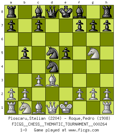 Last move : 1-0 2024 June 30 11:41:37 [Event "FICGS__CHESS__THEMATIC_TOURNAMENT__000264"] [Site "FICGS"] [Date "2024.04.17"] [Round "1"] [White "Ploscaru,Stelian"] [Black "Roque,Pedro"] [Result "1-0"] [WhiteElo "2204"] [BlackElo "1908"] 1.e4 e5 2.Nf3 Nc6 3.Bc4 Nf6 4.Ng5 d5 5.exd5 Nxd5 6.d4 Nxd4 7.c3 b5 8.Bd3 1-0 This chess game has been lost on time (started : 2024.04.17 12:51:34) Follow this game move after move (download)Chess is really ninety nine percent calculation. (Soltis) Im Schach gibt es keinen Platz für Galanterie. (Irving Chernev) Durante una competencia de Ajedrez, un Maestro de Ajedrez deberá ser una combinación de presa de caza y un Monge. (Alexander Alekhine) Des idées, des idées, j'en ai cent, j'en ai mille. Des bonnes, des mauvaises, applicables, irréalisables... Il suffit de faire le tri ! (Roos) All war is based on deception. (Sun Tzu)