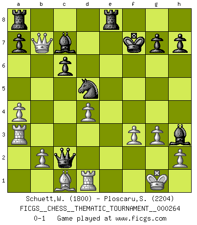 Last move : 0-1 2024 September 28 21:55:2 [Event "FICGS__CHESS__THEMATIC_TOURNAMENT__000264"] [Site "FICGS"] [Date "2024.04.17"] [Round "1"] [White "Schuett,Wilhelm"] [Black "Ploscaru,Stelian"] [Result "0-1"] [WhiteElo "1800"] [BlackElo "2204"] 1.e4 e5 2.Nf3 Nc6 3.Bc4 Nf6 4.Ng5 d5 5.exd5 Nxd5 6.Nxf7 Kxf7 7.Qf3+ Ke6 8.Nc3 Ncb4 9.O-O c6 10.d4 Qf6 11.Qe2 Ke7 12.Ne4 Qg6 13.c3 Bf5 14.f3 Na6 15.Bxa6 bxa6 16.Nc5 Kf7 17.Qxa6 exd4 18.Qb7+ Be7 19.cxd4 Rhb8 20.Qa6 Bxc5 21.Rd1 Bb6 22.a4 Bc7 23.Ra3 Re8 24.Qb7 Bh3 25.g3 Qc2 0-1 Follow this game move after move (download)A man without frontiers. He didn't divide the East and the West, he brought them together in their admiration for him. (Ljubomir Ljubojevic, about Bobby Fischer's death) Ich bin es gewohnt, das die Jugend mir überhaupt keinen Respekt entgegenbringt. (Alexander Morozewich) Una compensación adecuada por un sacrificio es tener una combinación sólida que conduce a una posición ganadora; una compensación adecuada por una metida de pata es dejar a tu oponente arrebatar una derrota de las fauces de la victoria. (Bruce A. Moon) J'ai toujours senti une vague pitié pour l'homme qui ne connaît rien aux échecs, tout comme j'en aurais pour un homme ignorant de l'amour. Les Echecs, comme la musique ou comme l'amour, ont le pouvoir de rendre heureux. (Siegbert Tarrasch) Live, lose, and learn, by observing your opponent how to win. (Amber Steenbock)