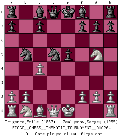 Last move : 1-0 2024 June 3 0:29:26 [Event "FICGS__CHESS__THEMATIC_TOURNAMENT__000264"] [Site "FICGS"] [Date "2024.04.17"] [Round "1"] [White "Trigance,Emile"] [Black "Zemlyanov,Sergey"] [Result "1-0"] [WhiteElo "1867"] [BlackElo "1255"] 1.e4 e5 2.Nf3 Nc6 3.Bc4 Nf6 4.Ng5 d5 5.exd5 Nxd5 6.d4 Nxd4 7.c3 b5 8.Bxb5+ Nxb5 9.c4 1-0 This chess game has been lost on time (started : 2024.04.17 12:51:34) Follow this game move after move (download)There is no remorse like the remorse of Chess. (H. G. Wells) Das Blackmar-Diemer-Gambit verändert den ganzen Menschen! (Emil Joseph Diemer) Solo los afeminados hacen el Enroque. (Rob Sillars) Les échecs sont un jeu par leur forme, un art par leur essence et une science par sa difficulté d'acquisition. Ils peuvent vous procurer autant de plaisir qu'un bon livre ou une belle musique, mais vous n'aurez une réelle joie que si vous arrivez à bien jouer. (Tigran Petrosian) Wikichess, chess moves explained by 'experimented' players. (Thibault de Vassal)