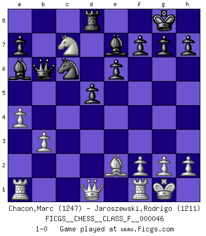 Last move : 1-0 2008 January 15 0:0:4 [Event "FICGS__CHESS__CLASS_F__000046"] [Site "FICGS"] [Date "2007.09.14"] [Round "1"] [White "Chacon,Marc"] [Black "Jaroszewski,Rodrigo"] [Result "1-0"] [WhiteElo "1247"] [BlackElo "1211"] 1.d4 Nf6 2.c4 e6 3.Nf3 d5 4.e3 Be7 5.Nc3 O-O 6.Be2 c6 7.O-O b6 8.Ne5 Bb7 9.c5 bxc5 10.b3 cxd4 11.exd4 c5 12.Be3 Nfd7 13.Bf3 cxd4 14.Bxd4 Nxe5 15.Bxe5 Nc6 16.Bg3 Rc8 17.Nb5 Ba6 18.Be2 Qb6 19.a4 Rfd8 20.Bc7 Rxc7 21.Nxc7 1-0 Queen's pawn game Kingside Castling by player Black (move 5) Kingside Castling by player White (move 7) Player White won this chess game. Follow this game move after move (download)Chess is a matter of delicate judgment, knowing when to punch and how to duck. (Bobby Fischer) Ich verlor meine Bürgerrechte, mein Gehalt wurde mir nicht mehr bezahlt und ich wurde zensiert und durfte nicht mehr ins Ausland reisen. [nach dem Match Fischer-Taimanov 6:0] (Mark Taimanov) El Ajedrez es un juego terrible. Si no dominas el centro, tu oponente tiene una posición mas libre. Si tu tienes el centro, entonces realmente tienes algo de que preocuparte. (Siegbert Tarrasch) La vie est comme un jeu d'échecs : nous esquissons un plan, mais celui-ci est tributaire de ce que daignent faire l'adversaire aux échecs et le destin dans la vie. (Arthur Schopenhauer) The best weapon against an enemy is another enemy. (Friedrich Nietzsche)
