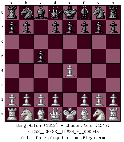 Last move : 0-1 2007 October 25 14:8:18 [Event "FICGS__CHESS__CLASS_F__000046"] [Site "FICGS"] [Date "2007.09.14"] [Round "1"] [White "Berg,Allen"] [Black "Chacon,Marc"] [Result "0-1"] [WhiteElo "1312"] [BlackElo "1247"] 1.e4 c5 0-1 This chess game has been lost on time (started : 2007.09.14 14:57:54) Sicilian defense Player Black won this chess game. Follow this game move after move (download)What would Chess be without silly mistakes ? (Kurt Richter) Alle offensichtlichen Züge sehen nach dem Spiel in der Analyse verdächtig aus. (Viktor Kortschnoi) Estaba muy claro de que el punto vulnerable del Gran Maestro Americano (Bobby Fischer) radicaba en las posiciones de doble filo, colgantes, irracionales, donde el siempre falló en encontrar un triunfo aún en una posición de clara victoria. (Efim Geller) Vous n'êtes pas toujours obligé de jouer le meilleur coup. Un coup doit être actif, entreprenant, correct et beau ! (David Bronstein) All men can see these tactics whereby I conquer, but what none can see is the strategy out of which victory is evolved. (Sun Tzu)