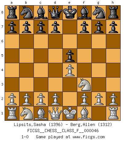 Last move : 1-0 2007 October 25 8:4:49 [Event "FICGS__CHESS__CLASS_F__000046"] [Site "FICGS"] [Date "2007.09.14"] [Round "1"] [White "Lipsits,Sasha"] [Black "Berg,Allen"] [Result "1-0"] [WhiteElo "1396"] [BlackElo "1312"] 1.e4 e5 2.Nf3 1-0 This chess game has been lost on time (started : 2007.09.14 14:57:54) King's knight Opening Player White won this chess game. Follow this game move after move (download)I give 98 percent of my mental energy to Chess. Others give only 2 percent. (Bobby Fischer) Gegen einen Schachcomputer zu verlieren ist wie Löcher in den Strümpfen zuhaben. Es ist nicht peinlich, solange man der einzige ist der es weiß. (Anonymous) Aquel que teme a un Peón de Reina aislado, debería de retirarse del Ajedrez. (Siegbert Tarrasch) Mais n'est-ce pas déjà le limiter injurieusement que d'appeler les échecs un jeu? N'est-ce pas aussi une science, un art, ou quelque chose qui, comme le cercueil de Mahomet entre ciel et terre, est suspendu entre l'un et l'autre, et qui réunit un nombre incroyable de contraires ? (Stefan Zweig) After growing wildly for years, the field of computing appears to be reaching its infancy. (John Pierce)