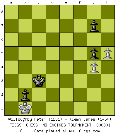 Last move : 0-1 2007 October 4 20:27:8 [Event "FICGS__CHESS__NO_ENGINES_TOURNAMENT__000001"] [Site "FICGS"] [Date "2007.09.15"] [Round "1"] [White "Willoughby,Peter"] [Black "Klemm,James"] [Result "0-1"] [WhiteElo "1261"] [BlackElo "1450"] 1.e4 c5 2.c3 Nf6 3.e5 Nd5 4.d4 e6 5.c4 Nc7 6.d5 exd5 7.cxd5 d6 8.Qa4+ Bd7 9.Qe4 dxe5 10.Qxe5+ Qe7 11.Qxe7+ Bxe7 12.Nc3 Bf5 13.Bb5+ Nxb5 14.Nxb5 Na6 15.Nf3 Bd3 16.Nc3 O-O-O 17.Bg5 Rhe8 18.Kd2 Bg6 19.Bxe7 Rxe7 20.Rae1 Rxe1 21.Rxe1 Nb4 22.a3 Nxd5 23.Nxd5 Rxd5+ 24.Kc3 b5 25.Kb3 Rd3+ 26.Ka2 a6 27.Ne5 Rd2 28.Nxg6 hxg6 29.Rf1 Kd7 30.g3 c4 31.Kb1 a5 32.h4 Rd3 33.f3 Ke6 34.g4 Kd5 35.Kc2 b4 36.axb4 axb4 37.Rd1 b3+ 38.Kc1 Rxd1+ 39.Kxd1 Kd4 40.f4 c3 41.bxc3+ Kxc3 42.Kc1 b2+ 43.Kb1 Kb3 44.f5 Kc3 45.fxg6 fxg6 46.h5 g5 0-1 Sicilian : Alapin's variation (2.c3) Queenside Castling by player Black (move 16) 10 pieces endgame at move 41 : White KPPPP , Black KPPPP WHITE : King + 4 Pawns BLACK : King + 4 Pawns 9 pieces endgame at move 41 : White KPPP , Black KPPPP WHITE : King + 3 Pawns BLACK : King + 4 Pawns 8 pieces endgame at move 45 : White KPPP , Black KPPP WHITE : King + 3 Pawns BLACK : King + 3 Pawns 7 pieces endgame at move 45 : White KPP , Black KPPP WHITE : King + 2 Pawns BLACK : King + 3 Pawns Player Black won this chess game. Follow this game move after move (download)In a gambit you give up a Pawn for the sake of getting a lost game. (Samuel Standige Boden) Fischer ist das größte Genie, das je vom Schachhimmel heruntergestiegen ist. (Mikhail Nekhemyevich Tal) El Ajedrez expande y enriquece tu mente. (Saudin Robovic) Aux échecs, les retours au sommet sont rares : les dommages psychologiques consécutifs à une défaite sont trop sévères. (Daily Telegraph) Life is verb, not a noun. (Charlotte Perkins Gilman)