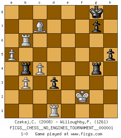 Last move : 1-0 2007 November 12 21:15:54 [Event "FICGS__CHESS__NO_ENGINES_TOURNAMENT__000001"] [Site "FICGS"] [Date "2007.09.15"] [Round "1"] [White "Czekaj,Christophe"] [Black "Willoughby,Peter"] [Result "1-0"] [WhiteElo "2008"] [BlackElo "1261"] 1.Nc3 e6 2.Nf3 f5 3.e4 fxe4 4.Nxe4 Nf6 5.Ng3 d5 6.d4 Nc6 7.Bb5 Bd7 8.O-O Bd6 9.Re1 O-O 10.Qe2 a6 11.Bxc6 bxc6 12.Ne5 c5 13.Nxd7 Qxd7 14.Qxe6+ Qxe6 15.Rxe6 Bxg3 16.hxg3 cxd4 17.Rc6 Ra7 18.b3 Ne4 19.Bb2 a5 20.Bxd4 Rb7 21.a4 Ra8 22.Rd1 Rf8 23.g4 Rf4 24.f3 Ng5 25.Be3 Nxf3+ 26.gxf3 Rxf3 27.Bd2 Rg3+ 28.Kf2 Rxg4 29.Bxa5 d4 30.Bxc7 h5 31.a5 Rb4 32.Rb6 d3 33.c4 1-0 Dunst (Sleipner, Heinrichsen) Opening Kingside Castling by player White (move 8) Kingside Castling by player Black (move 9) Player White won this chess game. Follow this game move after move (download)When I have White, I win because I am white; When I have Black, I win because I am Bogolyubov. (Bogolyubov) Die Fehler sind da, Sie warten nur darauf gemacht zu werden. (Savielly Grigorievitsch Tartakower) Tu cuerpo tiene que estar en óptima condición. Tu Ajedrez se deteriora como lo hace tu cuerpo. No puedes separar la mente y el cuerpo. (Bobby Fischer) Il a essayé de se convaincre qu'il pourrait empêcher toutes les erreurs et ne jamais perdre. L'horreur ! Gary Kasparov au sujet de Robert Fischer. A woman without a man is like a fish without a bicycle. (Gloria Steinem)