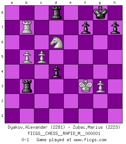 Last move : 0-1 2006 August 30 4:25:10 [Event "FICGS__CHESS__RAPID_M__000001"] [Site "FICGS"] [Date "2006.04.10"] [Round "1"] [White "Dyakov,Alexander"] [Black "Zubac,Marius"] [Result "0-1"] [WhiteElo "2281"] [BlackElo "2223"] 1.e4 c5 2.Nf3 Nc6 3.d4 cxd4 4.Nxd4 Nf6 5.Nc3 e5 6.Ndb5 d6 7.Bg5 a6 8.Na3 b5 9.Bxf6 gxf6 10.Nd5 f5 11.Bd3 Be6 12.Qh5 Rg8 13.g3 Rg5 14.Qd1 Bxd5 15.exd5 Ne7 16.c3 Bh6 17.Be2 Rc8 18.c4 Qa5 19.Kf1 b4 20.Nc2 Qb6 21.Qd3 a5 22.b3 Kf8 23.a3 bxa3 24.Rxa3 Rg7 25.Qc3 Nxd5 26.Qxa5 Qxa5 27.Rxa5 Nc3 28.Bf3 e4 29.Bh5 d5 30.f4 exf3 31.Nd4 Be3 32.Nxf5 Bb6 33.Ra6 Rg5 34.Rxb6 Rxh5 35.Nd6 Rd8 36.c5 Ne4 37.b4 Nxg3 38.hxg3 Rxh1 39.Kf2 d4 40.Kxf3 Re1 41.Kf2 Rb1 42.Rb7 Kg8 43.b5 Rb2 44.Kf3 Rb3 0-1 Sicilian : Pelikan (Lasker/Sveshnikov) variation Player Black won this chess game. Follow this game move after move (download)I play correspondence chess because it is both art and science while chess is art only. (A player at FICGS) Ich verstehe mehr vom Schach als irgendein anderer lebender Meister. (José Raúl Capablanca) Una partida de Ajedrez se divide en 3 etapas: la primera cuando piensas que tienes la ventaja, la segunda cuando crees que tienes la ventaja y la tercera... ¡cuando te das cuenta que vas a perder!. (Savielly Tartakower) Dans le domaine de la peinture, de la gravure et de la sculpture, dès la première décennie de notre siècle, les artistes abandonnent la représentation de la partie d'échecs pour se concentrer sur les pièces, sur les échiquiers et sur toutes les variations auxquelles les unes et les autres peuvent donner lieu. On passe en quelque sorte d'un thème social à un thème musical (au sens de la musica médiévale, c'est-à-dire d'une notion qui inclue le rythme, l'harmonie, la construction et la déconstruction, etc.). Graphiquement et picturalement, l'échiquier apparaît comme une structure ouverte, dynamique, d'une richesse infinie, autorisant toutes les combinatoires et débouchant sur des mouvements et des rythmes de nature exponentielle. (Michel Pastoureau) Mac users swear by their computers. PC users swear at their computers. (Author unknown)