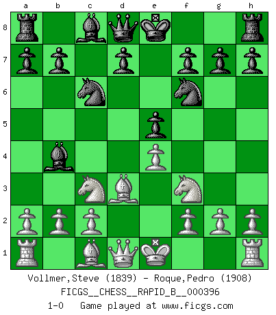 Last move : 1-0 2024 July 7 3:37:17 [Event "FICGS__CHESS__RAPID_B__000396"] [Site "FICGS"] [Date "2024.04.21"] [Round "1"] [White "Vollmer,Steve"] [Black "Roque,Pedro"] [Result "1-0"] [WhiteElo "1839"] [BlackElo "1908"] 1.e4 c5 2.Nf3 Nc6 3.d4 cxd4 4.Nxd4 Nf6 5.Nc3 e5 6.Nf3 Bb4 7.Bd3 1-0 This chess game has been lost on time (started : 2024.04.21 22:51:29) Follow this game move after move (download)Avoid the crowd. Do your own thinking independently. Be the Chess player, not the Chess piece. (Ralph Charell) Wie ich sie so einen nach dem anderen nieder mähte wurde meine Überlegenheit offensichtlich. (José Raúl Capablanca) Algunos sacrificios son sólidos, los demás son míos. (Mikhail Tal) Les échecs c'est le défi de l'alpiniste, toujours plus haut, prêt à tout pour monter à l'assaut du Roi ennemi. Les échecs, c'est de la musique en mouvement, un ballet majestueux pour les yeux. C'est de la poésie composée par les fantômes du passé qui au même titre que Rimbaud ou Verlaine méritent notre admiration. Les échecs, c'est de la peinture ou le moindre mouvement modifie le tableau pour en faire un Picasso ou un Van Gogh. Les échecs, c'est tout et rien, c'est la vie et la mort. Jjulie33 sur le forum de France-Echecs. Optimism is a variety of information deficit. Sometimes especially true for correspondence chess games. (Michael Aigner)