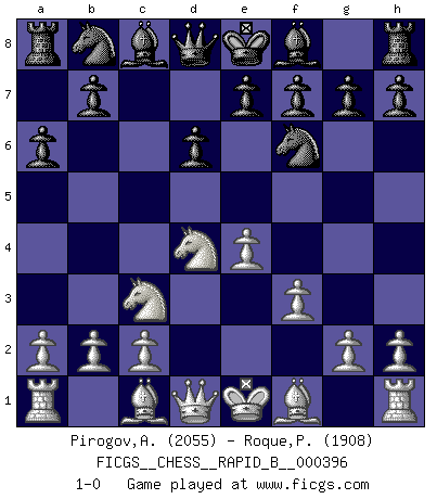 Last move : 1-0 2024 June 30 11:41:37 [Event "FICGS__CHESS__RAPID_B__000396"] [Site "FICGS"] [Date "2024.04.21"] [Round "1"] [White "Pirogov,Andrey Mikhaylovich"] [Black "Roque,Pedro"] [Result "1-0"] [WhiteElo "2055"] [BlackElo "1908"] 1.e4 c5 2.Nf3 d6 3.d4 cxd4 4.Nxd4 Nf6 5.Nc3 a6 6.f3 1-0 This chess game has been lost on time (started : 2024.04.21 22:51:29) Follow this game move after move (download)Bobby Fischer is the greatest Chess genius of all time ! (Alexander Kotov) Die Partien sind immer verschieden, die Interviews immer die gleichen. (Garry Kasparov) Me siento como si fuera una pieza en una partida de Ajedrez, cuando mi oponente me indica: esa pieza no puede ser movida. (Soren Kierkegaard) Le génie consiste à savoir transgresser les règles au moment opportun. (Teichmann) I've lost money so fast in these clubs it's left me reeling. I've read every poker book ever written, but the only way to get better at the game is to go out and play with people who are really good. The problem is, you stand to lose a lot of money doing it. (Matt Damon)