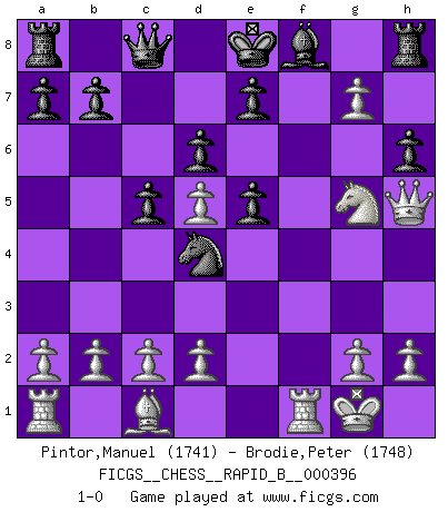 Last move : 1-0 2024 May 8 19:6:28 [Event "FICGS__CHESS__RAPID_B__000396"] [Site "FICGS"] [Date "2024.04.21"] [Round "1"] [White "Pintor,Manuel"] [Black "Brodie,Peter"] [Result "1-0"] [WhiteElo "1741"] [BlackElo "1748"] 1.e4 c5 2.f4 Nc6 3.Nf3 d6 4.Bc4 Be6 5.Bxe6 fxe6 6.O-O Nf6 7.Nc3 e5 8.f5 Qd7 9.Ng5 Qc8 10.Nd5 Nxd5 11.exd5 Nd4 12.Qh5+ g6 13.fxg6 h6 14.g7 1-0 Follow this game move after move (download)The older I grow, the more I value pawns. (Paul Keres) Ich verstehe mehr vom Schach als irgendein anderer lebender Meister. (José Raúl Capablanca) El Ajedrez demanda una total concentración. (Bobby Fischer) Même si l'adversaire joue le coup analysé précédemment, recommencez l'analyse en voyant la nouvelle position. Première règle de Blumenfeld However beautiful the strategy, you should occasionally look at the results. (Winston Churchill)