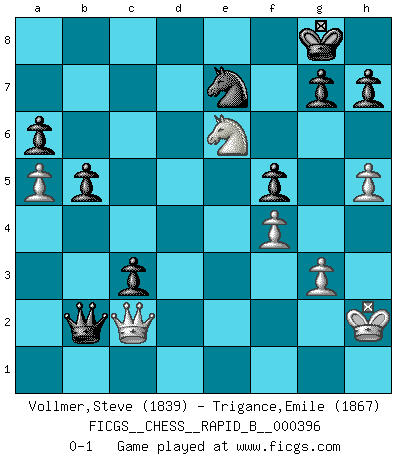 Last move : 0-1 2024 August 27 9:0:4 [Event "FICGS__CHESS__RAPID_B__000396"] [Site "FICGS"] [Date "2024.04.21"] [Round "1"] [White "Vollmer,Steve"] [Black "Trigance,Emile"] [Result "0-1"] [WhiteElo "1839"] [BlackElo "1867"] 1.d4 d5 2.c4 e6 3.Nc3 Nf6 4.Nf3 Bb4 5.Qc2 dxc4 6.e4 b5 7.a4 c6 8.Bd2 Bxc3 9.bxc3 Qc7 10.Be2 Bb7 11.O-O Nbd7 12.Rfb1 a6 13.g3 O-O 14.Bf4 Qd8 15.Bd6 Re8 16.a5 Nf8 17.Bb4 Ng6 18.Nd2 Qc7 19.f4 Nd7 20.Re1 c5 21.dxc5 Nxc5 22.Rad1 Rad8 23.Bf3 Nd3 24.Rf1 Nxb4 25.cxb4 Rd7 26.Kg2 Red8 27.h4 f5 28.exf5 exf5 29.h5 Ne7 30.Bxb7 Qxb7+ 31.Kh2 Rd3 32.Rfe1 c3 33.Nb3 Rxd1 34.Rxd1 Rxd1 35.Qxd1 Qd5 36.Qc2 Qc4 37.Nc5 Qxb4 38.Ne6 Qb2 0-1 Follow this game move after move (download)When asked, -How is that you pick better moves than your opponents?, I responded: I'm very glad you asked me that, because, as it happens, there is a very simple answer. I think up my own moves, and I make my opponent think up his. (Alexander Alekhine) Wenn Dein Gegner dir ein Remis anbietet, versuch herauszufinden, weshalb er glaubt schlechter zu stehen. (Nigel Short) El Ajedrez es un regaderazo frío para la mente. (Sir John Simon) On a dit que l'homme se distingue de l'animal par le fait qu'il achète plus de livres qu'il ne peut en lire. Je voudrais suggérer qu'inclure à la liste des livres quelques livres d'échecs rendrait la distinction manifeste. (Edward Lasker) Indecision is the key to flexibility. (Unknown)