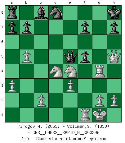 Last move : 1-0 2024 July 27 12:33:0 [Event "FICGS__CHESS__RAPID_B__000396"] [Site "FICGS"] [Date "2024.04.21"] [Round "1"] [White "Pirogov,Andrey Mikhaylovich"] [Black "Vollmer,Steve"] [Result "1-0"] [WhiteElo "2055"] [BlackElo "1839"] 1.Nf3 d5 2.d4 e6 3.e3 Nf6 4.Bd3 c5 5.b3 Nc6 6.O-O Bd6 7.dxc5 Bxc5 8.Bb2 O-O 9.Nbd2 Qe7 10.a3 e5 11.b4 Bxe3 12.fxe3 e4 13.Bxf6 gxf6 14.b5 Nd8 15.Bxe4 dxe4 16.Nd4 Qe5 17.Rf4 f5 18.Qh5 Kh8 19.Raf1 Rg8 20.Nxe4 Rg4 21.Rxg4 1-0 Follow this game move after move (download)Chess opens and enriches your mind. (Saudin Robovic) Der Verteidiger gebe der Gewalt nach, aber nur der Gewalt. Er schaffe sich nicht freiwillig, etwa aus Blindheit oder aus Schrecken, irgendwelche Schwächen. Er lasse sich nicht bluffen. (Emanuel Lasker) Solo los afeminados hacen el Enroque. (Rob Sillars) Le plus grand jeu de l'esprit jamais inventé, plus vous l'apprenez, plus vous y prenez du plaisir. (Garry Kasparov) Fame, I have already. Now I need the money. (an elderly Steinitz)