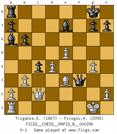 Last move : 0-1 2024 June 12 15:6:38 [Event "FICGS__CHESS__RAPID_B__000396"] [Site "FICGS"] [Date "2024.04.21"] [Round "1"] [White "Trigance,Emile"] [Black "Pirogov,Andrey Mikhaylovich"] [Result "0-1"] [WhiteElo "1867"] [BlackElo "2055"] 1.d4 d5 2.Nf3 Nf6 3.e3 e6 4.Bd3 c5 5.c3 b6 6.O-O Bb7 7.Nbd2 Be7 8.Ne5 O-O 9.f4 Qc8 10.g4 Ne4 11.Qc2 f6 12.Nef3 f5 13.Bxe4 fxe4 14.Ne5 cxd4 15.exd4 Ba6 16.c4 Nc6 17.Nxc6 Qxc6 18.b3 e5 19.fxe5 e3 20.Nf3 dxc4 21.Bxe3 Rxf3 22.Rxf3 Qxf3 0-1 Follow this game move after move (download)I am the best player in the world and I am here to prove it. (Bobby Fischer) Schach ist ein Kampf gegen den Fehler. (Johannes Herrman Zukertort) Botvinnik trató de alejar el misterio referente al Ajedrez, siempre relacionandolo a situaciones de la vida diaria. Solía llamar al Ajedrez un problema inexacto típico, similar a aquellos en que la gente tiene siempre que resolver a cada día. (Garry Kasparov) On est toujours la mazette de quelqu'un d'autre. (Anonyme) Luck never made a man wise. (Seneca, Letters to Lucilius)