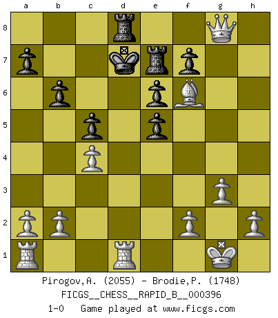 Last move : 1-0 2024 June 12 22:2:8 [Event "FICGS__CHESS__RAPID_B__000396"] [Site "FICGS"] [Date "2024.04.21"] [Round "1"] [White "Pirogov,Andrey Mikhaylovich"] [Black "Brodie,Peter"] [Result "1-0"] [WhiteElo "2055"] [BlackElo "1748"] 1.Nf3 Nf6 2.c4 c5 3.Nc3 Nc6 4.d4 d6 5.d5 Ne5 6.Nxe5 dxe5 7.Qb3 b6 8.g3 e6 9.Bg5 Be7 10.Bg2 O-O 11.d6 Rb8 12.dxe7 Qxe7 13.O-O Bb7 14.Bxb7 Rxb7 15.Ne4 h6 16.Nxf6+ gxf6 17.Bxh6 Rd8 18.Qf3 f5 19.e4 Qf6 20.exf5 Re7 21.Qg4+ Kh8 22.Bg5 Qxf5 23.Qh4+ Qh7 24.Bf6+ Kg8 25.Qg5+ Qg6 26.Qxg6+ Kf8 27.Qg7+ Ke8 28.Qg8+ Kd7 29.Rfd1+ 1-0 Follow this game move after move (download)Chess problems demand from the composer the same virtues that characterize all worthwhile art: originality, invention, conciseness, harmony, complexity, and splendid insincerity. (Vladimir Nabokov) Der Partner hat auch seine Existenzberechtigung. (Savielly Grigorievitsch Tartakower) El Ajedrez es un juego de pelea el cual es puramente intelectual e incluye la suerte. (Richard Reti) Le thème de l'attaque double intervient d'une manière ou d'une autre dans l'immense majorité des combinaisons. (Youri Averbakh) Experience is the name we all give to our mistakes. (Oscar Wilde)