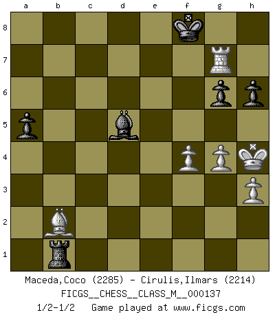 Last move : 1/2-1/2 2024 July 2 23:35:20 [Event "FICGS__CHESS__CLASS_M__000137"] [Site "FICGS"] [Date "2024.04.22"] [Round "1"] [White "Maceda,Coco"] [Black "Cirulis,Ilmars"] [Result "1/2-1/2"] [WhiteElo "2285"] [BlackElo "2214"] 1.e4 e6 2.d4 d5 3.Nc3 Nf6 4.e5 Nfd7 5.f4 c5 6.Nf3 Nc6 7.Be3 cxd4 8.Nxd4 Qb6 9.Qd2 Qxb2 10.Rb1 Qa3 11.Bb5 Nxd4 12.Bxd4 a6 13.Bxd7+ Bxd7 14.Rb3 Qe7 15.Rxb7 Qd8 16.Bb6 Qc8 17.Rc7 Qd8 18.Qd4 Ba3 19.Nb1 Be7 20.c4 O-O 21.cxd5 exd5 22.O-O Rc8 23.Rxc8 Qxc8 24.Nc3 Ba3 25.Nxd5 Qc6 26.h3 Rb8 27.Kh2 Be6 28.Ba7 Rb7 29.Rf3 Qxd5 30.Rxa3 Qxd4 31.Bxd4 Rb4 32.Rd3 Ra4 33.g4 Rxa2+ 34.Kg3 g6 35.Bc5 h6 36.Be7 Rc2 37.Rd6 a5 38.Bf6 Kh7 39.Ra6 Rc3+ 40.Kh4 Bd5 41.e6 Re3 42.Ra7 Rxe6 43.Rxf7+ Kg8 44.Rg7+ Kf8 45.Ba1 Re1 46.Bb2 Rb1 1/2-1/2 Follow this game move after move (download)Chess is a cold bath for the mind. (Sir John Simon) Pläne sind die Träume des Verständigen. (Ernst Freiherr von Feuchtersleben) El estómago es una parte esencial del maestro de Ajedrez. (Bent Larsen) Le temps de noter son nom sur la feuille de partie, j'étais déjà en zeitnot ! D'un modeste amateur apparié lors de la première ronde d'un open contre le grand-maître Azmaïparashvili. The bottom line is always the bottom line. (Johann Piek)
