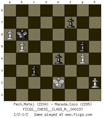 Last move : 1/2-1/2 2024 November 5 23:12:57 [Event "FICGS__CHESS__CLASS_M__000137"] [Site "FICGS"] [Date "2024.04.22"] [Round "1"] [White "Pech,Matej"] [Black "Maceda,Coco"] [Result "1/2-1/2"] [WhiteElo "2204"] [BlackElo "2285"] 1.e4 c5 2.Nf3 d6 3.d4 cxd4 4.Nxd4 Nf6 5.Nc3 a6 6.Be3 e5 7.Nb3 Be6 8.f3 h5 9.Qd2 Nbd7 10.O-O-O Be7 11.Kb1 b5 12.Nd5 Bxd5 13.exd5 Nb6 14.Bxb6 Qxb6 15.Na5 Rc8 16.Nc6 Nxd5 17.Nxe7 Nxe7 18.Qxd6 Qxd6 19.Rxd6 Nc6 20.Rd1 Ke7 21.c3 Rhd8 22.Be2 Na5 23.Rxd8 Rxd8 24.Kc2 Nc4 25.Bxc4 bxc4 26.Rd1 Rxd1 27.Kxd1 g5 28.g4 hxg4 29.fxg4 Kd6 30.Ke2 a5 31.b4 axb4 32.cxb4 e4 33.a4 c3 34.a5 Kc6 35.a6 Kb6 36.b5 Ka7 37.Ke3 Kb6 38.Ke2 Ka7 39.Ke3 Kb6 40.Ke2 1/2-1/2 Follow this game move after move (download)An attack on the wing should be met by play in the center. (Nimzovitch) Ivan Sokolov treibt mich als Beifahrer an mit go Loeky go - . (Loek van Wely) Un entendimiento a fondo de las continuaciones típicas del mate, hace de las combinaciones de sacrificio mas complicadas conducirlas a ellas no solo sin dificultad, sino casi de una manera natural. (Siegbert Tarrasch) Les Echecs sont et restent toujours un combat, un combat intégral comme la boxe, la lutte ou un autre sport, et où il doit y avoir un vainqueur et un vaincu. (Joseph Emil Diemer) Pushing plastic is for the many, pushing virtual pieces is for the fewer, pushing wood is for the very few. (Normajean Yates)