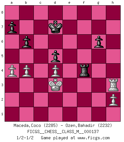 Last move : 1/2-1/2 2024 July 30 3:15:7 [Event "FICGS__CHESS__CLASS_M__000137"] [Site "FICGS"] [Date "2024.04.22"] [Round "1"] [White "Maceda,Coco"] [Black "Ozen,Bahadir"] [Result "1/2-1/2"] [WhiteElo "2285"] [BlackElo "2232"] 1.e4 e5 2.Nf3 Nf6 3.Nxe5 d6 4.Nf3 Nxe4 5.d4 d5 6.Bd3 Bd6 7.O-O O-O 8.c4 c6 9.Re1 Bf5 10.Qb3 Qd7 11.Nc3 Nxc3 12.Bxf5 Qxf5 13.bxc3 b6 14.cxd5 cxd5 15.Qb5 Qd7 16.Rb1 Rd8 17.a4 Qxb5 18.Rxb5 Na6 19.Bd2 Nc7 20.Rb2 Kf8 21.g3 h5 22.Kf1 Re8 23.Reb1 g6 24.Nh4 Re6 25.Be3 Ke7 26.Ng2 Kd7 27.Ke2 Rd8 28.Kd3 Kc6 29.Bd2 Rde8 30.Rc2 R8e7 31.R2c1 Rd7 32.Ne3 h4 33.Rh1 Rd8 34.Rhg1 h3 35.Rbc1 f6 36.Rb1 Rd7 37.Rbf1 Rf7 38.Nc2 Re4 39.f3 Re6 40.f4 f5 41.Rf3 Kd7 42.g4 fxg4 43.Rxg4 Ref6 44.Rxh3 Ne6 45.Nb4 Bxb4 46.cxb4 Rxf4 47.Bxf4 Nxf4+ 48.Rxf4 Rxf4 1/2-1/2 Follow this game move after move (download)Fischer is completely natural. He plays no roles. He's like a child. Very, very simple. (Zita Rajcsanyi) Computer sind die einzigen Gegner, die nicht immer eine Ausrede auf Lager haben, wenn sie gegen mich verlieren. (Robert James Fischer) Fischer es una tragedia del Ajedrez Americano a la par con Morphy y Pillsbury. (Mig Greengard) La tactique, c'est ce que vous faites quand il y a quelque chose à faire; la stratégie, c'est ce que vous faites quand il n'y a rien à faire. (Savielli Tartacower) Life is verb, not a noun. (Charlotte Perkins Gilman)