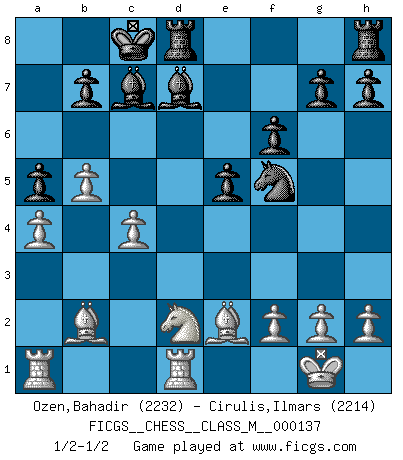 Last move : 1/2-1/2 2024 May 9 16:8:38 [Event "FICGS__CHESS__CLASS_M__000137"] [Site "FICGS"] [Date "2024.04.22"] [Round "1"] [White "Ozen,Bahadir"] [Black "Cirulis,Ilmars"] [Result "1/2-1/2"] [WhiteElo "2232"] [BlackElo "2214"] 1.e4 e6 2.d4 d5 3.Nd2 c5 4.Ngf3 cxd4 5.exd5 Qxd5 6.Bc4 Qd8 7.O-O a6 8.Nb3 Nc6 9.Nbxd4 Nxd4 10.Qxd4 Qxd4 11.Nxd4 Bd7 12.Be2 Bd6 13.Rd1 O-O-O 14.Nf3 Bc7 15.a4 f6 16.b4 Ne7 17.b5 a5 18.c4 e5 19.Nd2 Nf5 20.Bb2 1/2-1/2 Follow this game move after move (download)Chess is so inspiring that I do not believe a good player is capable of having an evil thought during the game. (Wilhelm Steinitz) Intelligenz läßt sich nicht am Weg, sondern nur am Ergebnis feststellen. (Garry Kasparov) El tablero es el mundo, las piezas es el fenomeno del universo, las reglas del juego son lo que llamamos leyes de la naturaleza y el jugador del lado opuesto, se encuentra oculto a nuestra vista. (Thomas Huxley) Si rien de grave n'est détecté lors de l'analyse d'une position, on joue alors le coup. Seconde règle de Blumenfeld. You must have a dream in order to have it come true. (A.P.J. Kalam)
