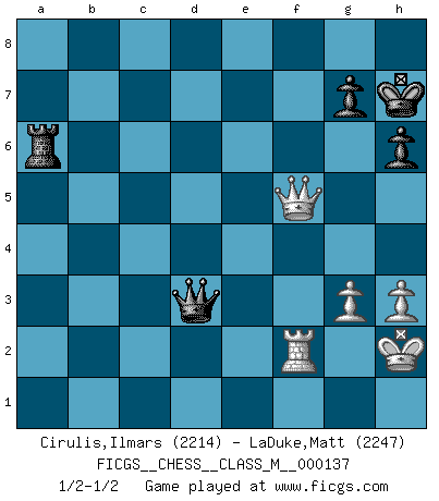 Last move : 1/2-1/2 2024 May 27 23:9:31 [Event "FICGS__CHESS__CLASS_M__000137"] [Site "FICGS"] [Date "2024.04.22"] [Round "1"] [White "Cirulis,Ilmars"] [Black "LaDuke,Matt"] [Result "1/2-1/2"] [WhiteElo "2214"] [BlackElo "2247"] 1.e4 e5 2.Nf3 Nc6 3.d4 exd4 4.Nxd4 Nf6 5.Nc3 Bb4 6.Nxc6 bxc6 7.Bd3 d5 8.O-O Bxc3 9.bxc3 dxe4 10.Qe2 O-O 11.Bxe4 Re8 12.Bg5 Bf5 13.f3 Qe7 14.Bxf6 Qxf6 15.Qc4 Bxe4 16.fxe4 Qg6 17.Rf5 Rad8 18.Raf1 Rd7 19.h3 R8e7 20.Qa6 h6 21.a4 Rd2 22.R5f2 Rxf2 23.Rxf2 Qxe4 24.Qxa7 Qe1+ 25.Rf1 Qxc3 26.a5 Qxc2 27.a6 Re2 28.Rf2 Qd1+ 29.Kh2 Re1 30.Qa8+ Kh7 31.Qxc6 Re6 32.Qxc7 Rxa6 33.Qxf7 Qd6+ 34.g3 Qd3 35.Qf5+ 1/2-1/2 Follow this game move after move (download)Live, lose, and learn, by observing your opponent how to win. (Amber Steenbock) Alle offensichtlichen Züge sehen nach dem Spiel in der Analyse verdächtig aus. (Viktor Kortschnoi) Vive, pierde y aprende al observar a tu oponente como ganar. (Amber Steenbock) Il vaut mieux sacrifier les pièces de l'adversaire. (Xavier Tartacover) It's only after you lost everything, Tyler says, that you're free to do anything. (Chuck Palahniuk, Fight Club)