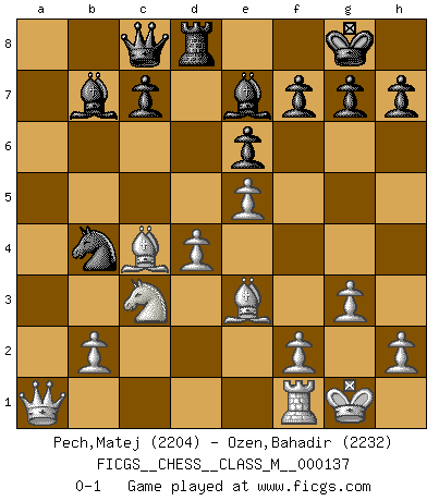 Last move : 0-1 2024 July 29 22:36:45 [Event "FICGS__CHESS__CLASS_M__000137"] [Site "FICGS"] [Date "2024.04.22"] [Round "1"] [White "Pech,Matej"] [Black "Ozen,Bahadir"] [Result "0-1"] [WhiteElo "2204"] [BlackElo "2232"] 1.d4 d5 2.c4 dxc4 3.Nf3 Nf6 4.Nc3 a6 5.e4 b5 6.e5 Nd5 7.a4 e6 8.axb5 Nb6 9.Be3 Bb7 10.bxa6 Rxa6 11.Rxa6 Nxa6 12.Be2 Nb4 13.O-O Be7 14.Nd2 Qa8 15.g3 O-O 16.Nxc4 Nxc4 17.Bxc4 Rd8 18.Qa1 Qc8 0-1 This chess game has been lost on time (started : 2024.04.22 21:58:11) Follow this game move after move (download)Combinations have always been the most intriguing aspect of Chess. The masters look for them, the public applauds them, the critics praise them. It is because combinations are possible that Chess is more than a lifeless mathematical exercise. They are the poetry of the game; they are to Chess what melody is to music. They represent the triumph of mind over matter. (Reuben Fine) Sie führen leise Selbstgespräche, schlürfen lautstark ihre Getränke, schmatzen hörbar beim Essen, blasen ihrem Gegenüber Rauch in die Augen, niesen ihm ins Gesicht, starren ihn unverwandt an, bis er sich unter ihren Blicken windet, rutschen ständig auf ihrem Stuhl hin und her, rülpsen und bohren in der Nase. (Anonymous) Tu no necesitas jugar muy bien, únicamente ayudar a tu oponenet a que juegue muy mal. (Genrikh Chepukaitis) Plusieurs personnes se sont demandées comment Tal faisait pour gagner... En fait, c'est très simple ! Il met ses pièces au centre de l'échiquier et les sacrifie quelque part ! (David Bronstein) There are lots of people who mistake their imagination for their memory. (Josh Bilings)