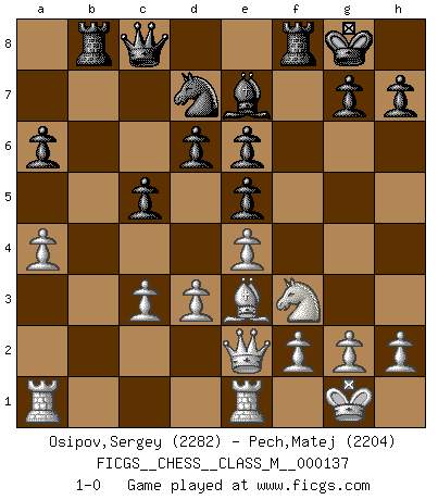 Last move : 1-0 2024 July 25 0:3:37 [Event "FICGS__CHESS__CLASS_M__000137"] [Site "FICGS"] [Date "2024.04.22"] [Round "1"] [White "Osipov,Sergey"] [Black "Pech,Matej"] [Result "1-0"] [WhiteElo "2282"] [BlackElo "2204"] 1.e4 e5 2.Nf3 Nc6 3.Bb5 a6 4.Ba4 Nf6 5.O-O Be7 6.Re1 b5 7.Bb3 O-O 8.a4 b4 9.d3 d6 10.Nbd2 Na5 11.Ba2 c5 12.c3 Rb8 13.Nc4 Nxc4 14.Bxc4 bxc3 15.bxc3 Be6 16.Bxe6 fxe6 17.Bg5 Nd7 18.Be3 Qc8 19.Qe2 1-0 This chess game has been lost on time (started : 2024.04.22 21:58:11) Follow this game move after move (download)White lost because he failed to remember the right continuation and had to think up the moves himself. (Siegbert Tarrasch) Nicht daß Diemer aus Opportunismus Mitglied der NSDAP geworden wäre. Er war ein Fanatiker, in allem, was er tat. (Hans Ree) Los Peones son nacidos libres, y aún así, se encuentran por doquier encadenados. (Rick Kennedy) Echiquier : carré parfait, comme la Jérusalem nouvelle décrite par l'auteur de l'Apocalypse, huit cases sur huit, exaltation du chiffre 4, symbole du cosmos aux quatre horizons... où le noir et le blanc, l'ombre et la lumière, le mal et le bien s'entremêlent et se conjuguent. (Robert Couffignal, Le Gambit du poète) Drag your thoughts away from your troubles... by the ears, by the heels, or any other way you can manage it. (Mark Twain)
