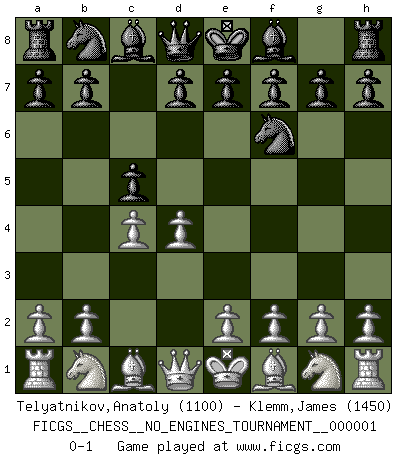 Last move : 0-1 2007 October 26 2:19:20 [Event "FICGS__CHESS__NO_ENGINES_TOURNAMENT__000001"] [Site "FICGS"] [Date "2007.09.15"] [Round "1"] [White "Telyatnikov,Anatoly"] [Black "Klemm,James"] [Result "0-1"] [WhiteElo "1100"] [BlackElo "1450"] 1.d4 Nf6 2.c4 c5 0-1 This chess game has been lost on time (started : 2007.09.15 22:11:45) Benoni defense Player Black won this chess game. Follow this game move after move (download)Chess is like life. (Boris Spassky) Schach ist ein Teil der Kultur, und wenn es mit der Kultur abwärts geht, geht es auch mit dem Schach abwärts. (Mikhail Moiseyevich Botvinik) El Ajedrez te enseña a controlarl la excitación inicial que sientes cuando vez algo que parece bueno y te enseña a pensar objetivamente cuando te encuentras en problemas. (Stanley Kubrick) Les échecs, c'est l'imagination. (David Bronstein) Vladimir Ras-Putin is still alive... He is also a good actor, I saw him in the Lord of the Rings. (Rodolfo d'Ettorre)