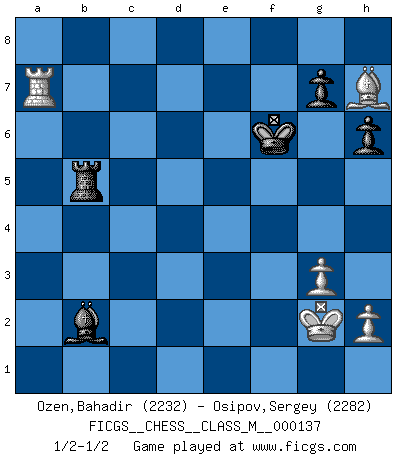 Last move : 1/2-1/2 2024 May 11 7:56:6 [Event "FICGS__CHESS__CLASS_M__000137"] [Site "FICGS"] [Date "2024.04.22"] [Round "1"] [White "Ozen,Bahadir"] [Black "Osipov,Sergey"] [Result "1/2-1/2"] [WhiteElo "2232"] [BlackElo "2282"] 1.d4 Nf6 2.c4 e6 3.Nf3 d5 4.Nc3 c5 5.cxd5 cxd4 6.Qxd4 exd5 7.e4 dxe4 8.Qxd8+ Kxd8 9.Ng5 Be6 10.a3 Nbd7 11.g3 Nc5 12.Nxe6+ fxe6 13.Be3 Rc8 14.Rb1 Bd6 15.Bg2 Be5 16.Bxc5 Rxc5 17.Nxe4 Nxe4 18.Bxe4 h6 19.O-O Ke7 20.Rfe1 b5 21.Kg2 Rb8 22.Re2 b4 23.axb4 Rxb4 24.Bh7 Kf6 25.f4 Bb8 26.Rd1 e5 27.fxe5+ Bxe5 28.Rd7 Rxb2 29.Rxb2 Bxb2 30.Rxa7 Rb5 1/2-1/2 Follow this game move after move (download)War is the child of passion, passion is the child of narcissism and narcissism is the child. (...) Another game ? (Thibault de Vassal) Wenn Spassky eine Figur opfert kannst du genauso gut aufgeben. Aber wenn Tal eine Figur opfert, spiel weiter. Er könnte noch eine weitere opfern, und dann ... wer weiß? (Miguel Najdorf) En la perfecta combinación de Ajedrez como en una historia corta de primera clase, toda la trama y contra trama deberá conducir hacia un final sorprendente, el interes no es mitigado hasta el último momento. (Yates and Winter) L'attaque fait le spectacle, la défense gagne les matchs. (Dicton footballistique) Nobody is always a winner, and anybody who says he is, is either a liar or doesn't play poker. (Amarillo Slim)