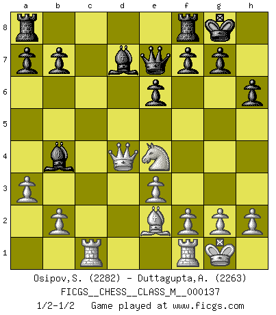 Last move : 1/2-1/2 2024 June 24 17:38:10 [Event "FICGS__CHESS__CLASS_M__000137"] [Site "FICGS"] [Date "2024.04.22"] [Round "1"] [White "Osipov,Sergey"] [Black "Duttagupta,Aniruddha"] [Result "1/2-1/2"] [WhiteElo "2282"] [BlackElo "2263"] 1.d4 Nf6 2.c4 e6 3.Nf3 d5 4.Nc3 Bb4 5.Bg5 h6 6.Bxf6 Qxf6 7.e3 O-O 8.Rc1 dxc4 9.Bxc4 c5 10.O-O cxd4 11.Ne4 Qe7 12.Nxd4 Bd7 13.Be2 Nc6 14.a3 Nxd4 15.Qxd4 1/2-1/2 Follow this game move after move (download)I played Chess with him and would have beaten him sometimes only he always took back his last move, and ran the game out differently. (Mark Twain) Gewöhnliche Menschen denken nur daran, wie sie ihre Zeit verbringen. Ein intelligenter Mensch versucht, sie auszunutzen. (Arthur Schopenhauer) Todo lo que importa ante el tablero de Ajedrez son buenas jugadas. (Bobby Fischer) Le thème de l'attaque double intervient d'une manière ou d'une autre dans l'immense majorité des combinaisons. (Youri Averbakh) All maxims have their antagonist maxims; proverbs should be sold in pairs, a single one being but a half truth. (William Mathews)