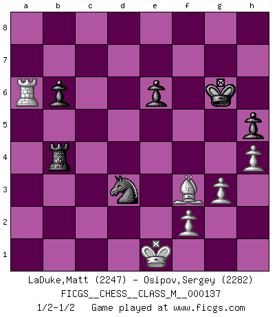 Last move : 1/2-1/2 2024 May 17 1:5:36 [Event "FICGS__CHESS__CLASS_M__000137"] [Site "FICGS"] [Date "2024.04.22"] [Round "1"] [White "LaDuke,Matt"] [Black "Osipov,Sergey"] [Result "1/2-1/2"] [WhiteElo "2247"] [BlackElo "2282"] 1.Nf3 Nf6 2.c4 e6 3.Nc3 d5 4.d4 c5 5.cxd5 cxd4 6.Qxd4 exd5 7.e4 dxe4 8.Qxd8+ Kxd8 9.Ng5 Be6 10.Nxe6+ fxe6 11.Bg5 Nc6 12.O-O-O Ke8 13.Bb5 Rc8 14.Kb1 Bb4 15.Bxf6 gxf6 16.Nxe4 Ke7 17.a3 f5 18.axb4 fxe4 19.Rhe1 Rhf8 20.Re2 Rcd8 21.Rxd8 Nxd8 22.Ba4 b6 23.Kc1 h5 24.g3 a6 25.h4 Nb7 26.Bc2 Nd6 27.Kd1 Rf3 28.Ke1 Kf6 29.Rd2 Nc4 30.Rd4 Nxb2 31.Bxe4 Rc3 32.Rd7 Rb3 33.Ra7 Rxb4 34.Bf3 Kg6 35.Rxa6 Nd3+ 1/2-1/2 Follow this game move after move (download)I like to say that Bobby Fischer was the greatest player ever. But what made Fischer a genius was his ability to blend an American freshness and pragmatism with Russian ideas about strategy. (Bruce Pandolfini) Im Schach gibt es keinen Platz für Galanterie. (Irving Chernev) Nunca nadie ha ganado una partida de Ajedrez rindiendose. (Unknown) Il s'avisa de me proposer d'apprendre les échecs qu'il jouait un peu... me voilà forcené des échecs. J'achète un échiquier, je m'enferme dans ma chambre, j'y passe des jours et des nuits à vouloir apprendre par cur toutes les parties. (Jean-Jacques Rousseau, Confessions) Wawaweewa ! (Borat: Cultural learnings of America for make benefit glorious nation of Kazakhstan)