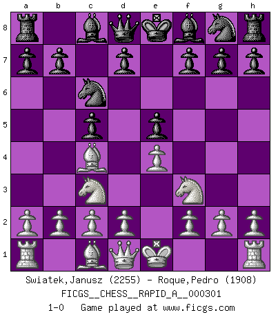 Last move : 1-0 2024 June 29 23:37:33 [Event "FICGS__CHESS__RAPID_A__000301"] [Site "FICGS"] [Date "2024.04.26"] [Round "1"] [White "Swiatek,Janusz"] [Black "Roque,Pedro"] [Result "1-0"] [WhiteElo "2255"] [BlackElo "1908"] 1.e4 c5 2.Nf3 Nc6 3.Nc3 e5 4.Bc4 1-0 This chess game has been lost on time (started : 2024.04.26 21:27:1) Follow this game move after move (download)A man without frontiers. He didn't divide the East and the West, he brought them together in their admiration for him. (Ljubomir Ljubojevic, about Bobby Fischer's death) Ich organisiere ein großes Turnier, was mich etwa 120000 Dollar kostet. Ich denke, das ist das erste Mal in der Schachgeschichte, daß ein Schachgroßmeister auch als Mäzen auftritt. (Miguel Najdorf) ¡Examina movidas que hagan daño! Un buen ojo for movidas desvastantes es mucho mas importante que el conocimiento de principios estratégicos. (Purdy) Les échecs, c'est l'art d'analyser. (Mikhail Botvinnik) Chess is everything: art, science and sport. (Anatoly Karpov)