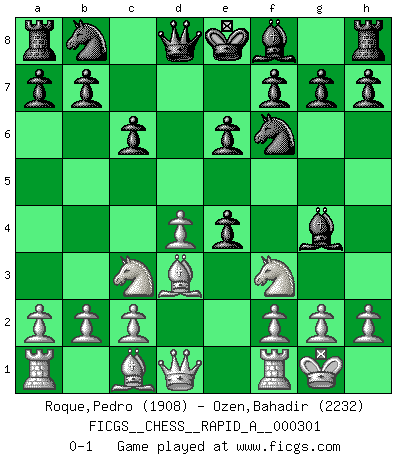Last move : 0-1 2024 July 8 11:2:41 [Event "FICGS__CHESS__RAPID_A__000301"] [Site "FICGS"] [Date "2024.04.26"] [Round "1"] [White "Roque,Pedro"] [Black "Ozen,Bahadir"] [Result "0-1"] [WhiteElo "1908"] [BlackElo "2232"] 1.e4 c6 2.Nf3 d5 3.Nc3 Bg4 4.d4 e6 5.Bd3 Nf6 6.O-O dxe4 0-1 This chess game has been lost on time (started : 2024.04.26 21:27:1) Follow this game move after move (download)Chess is war over the board. The object is to crush the opponents mind. (Bobby Fischer) Ich verstehe Aljechins Kombinationen ganz gut; aber woher er diese Angriffschancen bekommt und wie er die Eröffnung behandelt das ist für mich ein Buch mit sieben Siegeln. (Rudolf Spielmann) Observen a Garry Kasparov. Después de una derrota, invariablemente el gana la próxima partida. Prácticamente hace pedazos a su siguiente oponente. Eso es algo que tenemos que aprender a lograr. (Maurice Ashley) Toute estimation doit être constamment réévaluée. (Jacob Estrin) The man who strikes first admits that his ideas have given out. (Chinese proverb)
