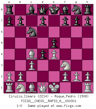 Last move : 1-0 2024 June 28 17:39:20 [Event "FICGS__CHESS__RAPID_A__000301"] [Site "FICGS"] [Date "2024.04.26"] [Round "1"] [White "Cirulis,Ilmars"] [Black "Roque,Pedro"] [Result "1-0"] [WhiteElo "2214"] [BlackElo "1908"] 1.e4 c5 2.d4 cxd4 3.Nf3 e5 4.c3 Nc6 5.Bc4 1-0 This chess game has been lost on time (started : 2024.04.26 21:27:1) Follow this game move after move (download)During a Chess competition a Chessmaster should be a combination of a beast of prey and a monk. (Alexander Alekhine) Ich verachte Kasparow. (Viktor Kortschnoi) El Ajedrez detiene a su maestro dentro de sus propios vínculos, encadenando la mente y el cerebro, por lo que la libertad interior del mas fuerte debe sufrir. (Albert Einstein) Le génie consiste à savoir transgresser les règles au moment opportun. (Teichmann) The human is the only animal species whose members are able to talk themselves into difficulties that would not otherwise exist. (Wendell Johnson)