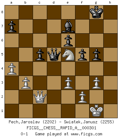 Last move : 0-1 2024 September 1 4:26:32 [Event "FICGS__CHESS__RAPID_A__000301"] [Site "FICGS"] [Date "2024.04.26"] [Round "1"] [White "Pech,Jaroslav"] [Black "Swiatek,Janusz"] [Result "0-1"] [WhiteElo "2202"] [BlackElo "2255"] 1.d4 Nf6 2.c4 e6 3.g3 Bb4+ 4.Bd2 Be7 5.Bg2 d5 6.Nf3 O-O 7.O-O c6 8.Qc2 b6 9.Rd1 Nbd7 10.b3 h6 11.Bc3 Bb7 12.Nbd2 c5 13.dxc5 bxc5 14.cxd5 Nxd5 15.Bb2 Qc7 16.Nc4 Rfd8 17.a3 Rab8 18.Nfd2 Ba8 19.h4 N5b6 20.Bxa8 Rxa8 21.Rac1 Nf6 22.Be5 Qc6 23.Na5 Qb5 24.Ndc4 Nxc4 25.Nxc4 Qb7 26.Bc3 Rxd1+ 27.Rxd1 Rd8 28.Rxd8+ Bxd8 29.Bxf6 Bxf6 30.e3 Be7 31.Nd2 Qa6 32.Nc4 Qb7 33.Kh2 Qf3 34.a4 g5 35.hxg5 hxg5 36.Kg1 f5 37.Ne5 Qd5 0-1 This chess game has been lost on time (started : 2024.04.26 21:27:1) Follow this game move after move (download)Later, I began to succeed in decisive games. Perhaps because I realized a very simple truth: not only was I worried, but also my opponent. (Mikhail Tal) Die Arbeit ist etwas Unnatürliches. Die Faulheit allein ist göttlich. (Anatole France) La mitad de las variaciones que son calculadas en una partida de torneo, resultan ser completamente superfluas. Desafortunadamente, nadie sabe por adelantado cual mitad. (Jan Tinman) Karpov est une pièce de musée. (Garry Kasparov) The only sure thing about luck is that it will change. (Wilson Mizner)