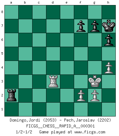 Last move : 1/2-1/2 2024 September 16 1:7:44 [Event "FICGS__CHESS__RAPID_A__000301"] [Site "FICGS"] [Date "2024.04.26"] [Round "1"] [White "Domingo,Jordi"] [Black "Pech,Jaroslav"] [Result "1/2-1/2"] [WhiteElo "2053"] [BlackElo "2202"] 1.e4 e5 2.Nf3 Nc6 3.Bc4 Nf6 4.d3 Bc5 5.c3 a6 6.a4 d6 7.b4 Ba7 8.O-O O-O 9.h3 Ne7 10.Nbd2 c6 11.Bb3 Ng6 12.Re1 Re8 13.d4 Be6 14.Bxe6 Rxe6 15.Qc2 h6 16.dxe5 dxe5 17.Nc4 b5 18.Rd1 Qb8 19.Ne3 c5 20.Nd5 cxb4 21.cxb4 Nxd5 22.exd5 Rd6 23.Bb2 Rf6 24.d6 Rxd6 25.Rxd6 Qxd6 26.axb5 Qxb4 27.bxa6 Re8 28.Ba3 Qb8 29.Rb1 Qd8 30.Rd1 Qb6 31.Rd6 Qb5 32.Qc6 Qxc6 33.Rxc6 e4 34.Ne1 Ne5 35.Rc7 Ra8 36.Bc5 Bxc5 37.Rxc5 Nd3 38.Nxd3 exd3 39.Rd5 Rxa6 40.Rxd3 Ra1+ 41.Kh2 Ra2 42.Kg3 Kh7 43.h4 1/2-1/2 Follow this game move after move (download)The passed Pawn is a criminal, who should be kept under lock and key. Mild measures, such as police surveillance, are not sufficient. (Aaron Nimzovich) Die Idee von Capablanca, Schach als Fach in den Schulen zu lehren, ist großartig. (Fidel Castro) Haz el enroque temprano y seguido. (Rob Sillars) A ce moment-là, je menaçais de comprendre la position ! (Clément L'Heureux) The only difference between a tax man and a taxidermist is that the taxidermist leaves the skin. (Mark Twain)