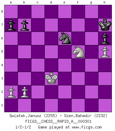 Last move : 1/2-1/2 2024 July 7 6:42:4 [Event "FICGS__CHESS__RAPID_A__000301"] [Site "FICGS"] [Date "2024.04.26"] [Round "1"] [White "Swiatek,Janusz"] [Black "Ozen,Bahadir"] [Result "1/2-1/2"] [WhiteElo "2255"] [BlackElo "2232"] 1.e4 c6 2.d4 d5 3.Nc3 dxe4 4.Nxe4 Bf5 5.Ng3 Bg6 6.Nf3 Nd7 7.h4 h6 8.h5 Bh7 9.Bd3 Bxd3 10.Qxd3 e6 11.Bd2 Ngf6 12.O-O-O Be7 13.Ne4 O-O 14.Nxf6+ Nxf6 15.Kb1 c5 16.g4 Nxg4 17.Qe2 cxd4 18.Rhg1 d3 19.cxd3 f5 20.Qxe6+ Kh8 21.d4 Bf6 22.Rc1 Nxf2 23.Rg2 Ne4 24.Bxh6 Qe8 25.Qxf5 Bxd4 26.Qg4 gxh6 27.Nxd4 Rg8 28.Qh3 Ng5 29.Qc3 Rc8 30.Qxc8 Qxc8 31.Rxc8 Rxc8 32.Nf5 Kh7 33.Rd2 Rf8 34.Rd7+ Rf7 35.Rxf7+ Nxf7 36.Kc2 Nd8 37.Kd3 Ne6 1/2-1/2 Follow this game move after move (download)Whoever sees no other aim in the game than that of giving checkmate to one's opponent will never become a good Chess player. (Euwe) Wenn ich Weiß habe gewinne ich weil ich Weiß habe, wenn ich Schwarz habe gewinne ich weil ich Bogoljubov bin. (Efim Bogoljubov) El Ajedrez es imaginación. (David Bronstein) Même si vous avez un bon coup à faire, regardez toujours s'il n'y en a pas un qui lui soit préférable. (Pedro Damiano) If only people were all showed a certain minimum level of niceness; if only people didn't retract verbal draw offers (without draw box ticked) on ficgs; if only people didn't kill; if only people didn't run concentration / extermination camps, if only people didn't drop nuclear bombs on Hiroshima and Nagasaki, and so on - it would be a much more beautiful world. But sadly, things are not so... (Normajean Yates)
