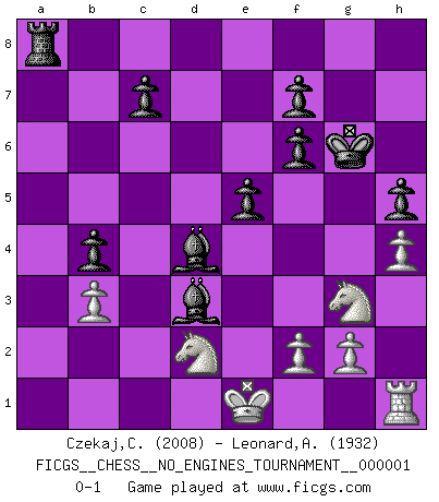 Last move : 0-1 2008 February 18 13:19:44 [Event "FICGS__CHESS__NO_ENGINES_TOURNAMENT__000001"] [Site "FICGS"] [Date "2007.09.15"] [Round "1"] [White "Czekaj,Christophe"] [Black "Leonard,Andrew"] [Result "0-1"] [WhiteElo "2008"] [BlackElo "1932"] 1.Nc3 e5 2.Nf3 Nc6 3.d4 d6 4.e4 Nf6 5.Bb5 Bd7 6.O-O Be7 7.Re1 a6 8.Bxc6 Bxc6 9.dxe5 dxe5 10.Qxd8+ Rxd8 11.Bg5 h6 12.Bh4 Bd6 13.Bxf6 gxf6 14.a3 O-O 15.Rad1 Kh7 16.Nh4 Bc5 17.Nf5 a5 18.Kf1 Kg6 19.Ke2 h5 20.h4 b5 21.Rh1 b4 22.axb4 axb4 23.Nb1 Bxe4 24.Ng3 Bxc2 25.Rxd8 Rxd8 26.Nd2 Bd3+ 27.Ke1 Bd4 28.b3 Ra8 0-1 Dunst (Sleipner-Heinrichsen) Opening Kingside Castling by player White (move 6) Kingside Castling by player Black (move 14) Player Black won this chess game. Follow this game move after move (download)No one ever won a game by resigning. (Unknown) Ich bin Weltmeister und muß mit niemandem irgend etwas diskutieren. (Viswanathan Anand) Por esta medida (el intervalo entre Fischer y sus contemporaneos), yo le considero el mas grande campeón mundial. (Garry Kasparov) Les Echecs ne sont pas pour les âmes timides. Ils requièrent un homme entier, qui ne s'arrête pas aveuglément à ce qui a été déjà établi, mais qui tente individuellement de sonder les profondeurs du jeu. (W. Steinitz) If you ain't just a little scared when you enter a casino, you are either very rich or you haven't studied the games enough. (Pappy)