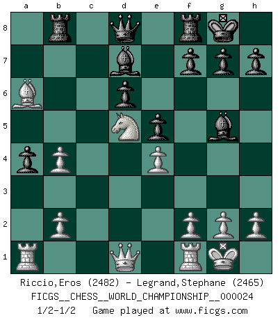 Last move : 1/2-1/2 2024 July 16 2:30:44 [Event "FICGS__CHESS__WORLD_CHAMPIONSHIP__000024"] [Site "FICGS"] [Date "2024.04.28"] [Round "1"] [White "Riccio,Eros"] [Black "Legrand,Stephane"] [Result "1/2-1/2"] [WhiteElo "2482"] [BlackElo "2465"] 1.e4 c5 2.Nf3 Nc6 3.d4 cxd4 4.Nxd4 Nf6 5.Nc3 e5 6.Ndb5 d6 7.Bg5 a6 8.Na3 b5 9.Nd5 Be7 10.Bxf6 Bxf6 11.c3 Rb8 12.Nc2 Bg5 13.a4 bxa4 14.Ncb4 Nxb4 15.cxb4 Bd7 16.Bxa6 O-O 17.O-O Qe8 18.Nc7 Qd8 19.Nd5 Qe8 20.Nc7 Qd8 21.Nd5 1/2-1/2 Follow this game move after move (download)There are tough players and nice guys, and I'm a tough player. (Bobby Fischer) Wer der Ansicht ist, daß alle Schachspieler verrückt sind, wird durch Studium des Lebens von Emil Josef Diemer nicht auf andere Gedanken kommen. (Hans Ree) El Ajedrez tiene tanto misterio como las mujeres. (Purdy) Les échecs, c'est l'art d'analyser. (Mikhail Botvinnik) As the days dwindle down... to a precious few. (Maxwell Anderson)