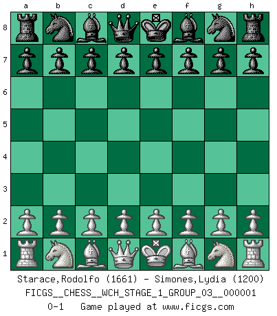 Last move : 0-1 2006 July 8 17:26:52 [Event "FICGS__CHESS__WCH_STAGE_1_GROUP_03__000001"] [Site "FICGS"] [Date "2006.07.01"] [Round "1"] [White "Starace,Rodolfo"] [Black "Simones,Lydia"] [Result "0-1"] [WhiteElo "1661"] [BlackElo "1200"] 0-1 Player Black won this chess game. Follow this game move after move (download)The Chess pieces are the block alphabet which shapes thoughts; and these thoughts, although making a visual design on the chessboard, express their beauty abstractly, like a poem. (Marcel Duchamp) Privat ist Kortschnoi kein schlechter Mensch, sehr sympathisch. Aber während des Spiels ist er grausam. Er will dich töten. (Miguel Najdorf) Cada Peón es potencialmente una Reina. (James Mason) Les échecs, c'est la lutte contre l'erreur. (Johannes Zukertort) If you ain't just a little scared when you enter a casino, you are either very rich or you haven't studied the games enough. (Pappy)