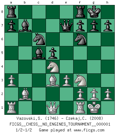 Last move : 1/2-1/2 2007 December 5 13:10:25 [Event "FICGS__CHESS__NO_ENGINES_TOURNAMENT__000001"] [Site "FICGS"] [Date "2007.09.15"] [Round "1"] [White "Vazovski,Sergey"] [Black "Czekaj,Christophe"] [Result "1/2-1/2"] [WhiteElo "1746"] [BlackElo "2008"] 1.d4 Nf6 2.c4 e6 3.Nc3 Bb4 4.e3 b6 5.Bd3 Bb7 6.Nf3 O-O 7.O-O d5 8.a3 Bd6 9.b4 c5 10.bxc5 bxc5 11.cxd5 exd5 12.dxc5 Bxc5 13.Ne2 Nc6 14.Bb2 Qe7 15.Ned4 1/2-1/2 Nimzo-Indian : Fischer variation Kingside Castling by player Black (move 6) Kingside Castling by player White (move 7) This chess game ended in a draw. Follow this game move after move (download)Of Chess it has been said that life is not long enough for it, but that is the fault of life, not Chess. (William Ewart Napier) Ich kenne Menschen, die allen Willen der Welt besitzen und doch nicht Schach spielen können. (Robert James Fischer) En manos de Fischer's, una diminuta ventaja teórica es tan buena como tener una Reina de ventaja. (Isaac Kashdan) Vous savez, camarade Pachman, je n'éprouve pas de plaisir à être ministre, je jouerais plutôt aux échecs comme vous, ou alors ferais une révolution au Venezuela. (Che Guevara à Ludek Pachman, 'Checkmate in Prague', 1975) Everybody lies. (Gregory House, House M.D.)