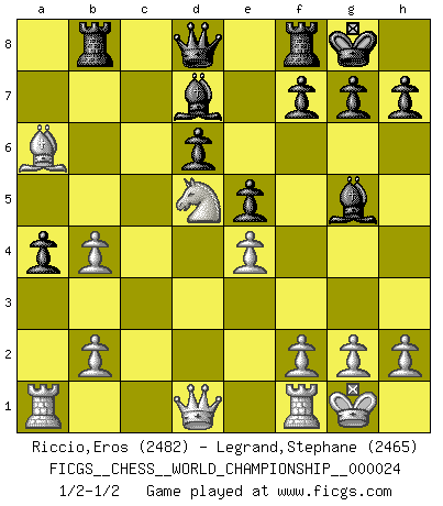Last move : 1/2-1/2 2024 July 16 2:37:11 [Event "FICGS__CHESS__WORLD_CHAMPIONSHIP__000024"] [Site "FICGS"] [Date "2024.04.28"] [Round "7"] [White "Riccio,Eros"] [Black "Legrand,Stephane"] [Result "1/2-1/2"] [WhiteElo "2482"] [BlackElo "2465"] 1.e4 c5 2.Nf3 Nc6 3.d4 cxd4 4.Nxd4 Nf6 5.Nc3 e5 6.Ndb5 d6 7.Bg5 a6 8.Na3 b5 9.Nd5 Be7 10.Bxf6 Bxf6 11.c3 Rb8 12.Nc2 Bg5 13.a4 bxa4 14.Ncb4 Bd7 15.Bxa6 Nxb4 16.cxb4 O-O 17.O-O Qe8 18.Nc7 Qd8 19.Nd5 Qe8 20.Nc7 Qd8 21.Nd5 1/2-1/2 Follow this game move after move (download)I guess a certain amount of temperament is expected of Chess geniuses. (Ron Gross) Schach verlangt totale Konzentration. (Robert James Fischer) En el Ajedrez, tal como es jugado por los Maestros, practicamente la suerte es eliminada. (Emanuel Lasker) Le jeu d'échecs fait naître et fortifie en nous plusieurs qualités précieuses dans le cours de l'existence, telles que la prévoyance, la circonspection, la prudence, et la persévérance. (Benjamin Franklin - 1783, la morale des échecs) You have to believe in yourself. (Sun Tzu)
