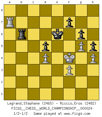 Last move : 1/2-1/2 2024 August 30 6:33:42 [Event "FICGS__CHESS__WORLD_CHAMPIONSHIP__000024"] [Site "FICGS"] [Date "2024.04.28"] [Round "8"] [White "Legrand,Stephane"] [Black "Riccio,Eros"] [Result "1/2-1/2"] [WhiteElo "2465"] [BlackElo "2482"] 1.c4 e6 2.Nc3 d5 3.d4 Nf6 4.cxd5 exd5 5.Bg5 c6 6.Qc2 h6 7.Bh4 Be7 8.e3 O-O 9.Bd3 Re8 10.Nge2 Nbd7 11.f3 b5 12.O-O Bb7 13.Kh1 a6 14.Rad1 c5 15.dxc5 Nxc5 16.Bf5 Qb6 17.a3 Rad8 18.Rfe1 Bf8 19.Nd4 Ncd7 20.Bxd7 Rxd7 21.Qf5 Rd6 22.Ra1 g6 23.Qb1 Qd8 24.Qd1 Ng4 25.Bxd8 Nf2+ 26.Kg1 Nxd1 27.Raxd1 R6xd8 28.b4 Rc8 29.Rd3 a5 30.bxa5 b4 31.Ncb5 bxa3 32.Nxa3 Ra8 33.Rb1 Bc8 34.Nab5 Rxa5 35.Nc7 Ba6 36.Nxa6 Rxa6 37.Rb2 Ra3 38.Rxa3 Bxa3 39.Rb3 Bc5 40.Kf2 Rd8 41.g4 Kg7 42.h4 Kf6 43.Rb5 Bxd4 44.exd4 Ke6 45.Kg3 Rd6 46.Kf4 Ra6 47.g5 h5 48.Rb3 Kd6 49.Rb8 Ke6 50.Rb7 Rc6 51.Ra7 Rb6 1/2-1/2 Follow this game move after move (download)The essence of Chess is thinking about what Chess is. (David Bronstein) Ich bin stolz ein Bulgare zu sein. (Veselin Topalov) El poder defensivo de una pieza clavada, solamente es imaginario. (Aaron Nimzovich) L'action d'une oeuvre littéraire se déroule sur un champ de bataille. Les masques et les types du drame moderne correspondent aux pièces du jeu d'échecs. L'intrigue correspond aux coups et aux gambits, c'est à dire aux techniques du jeu telles qu'utilisées et interprétées par les joueurs. Les tactiques et les péripéties [mouvements] correspondent aux coups exécutés par l'adversaire. (Viktor Shklovsky) Macintosh - we might not get everything right, but at least we knew the century was going to end. (Douglas Adams)