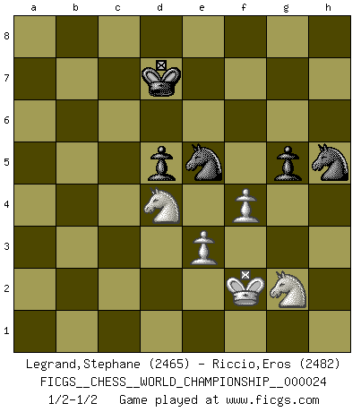 Last move : 1/2-1/2 2024 August 29 0:39:10 [Event "FICGS__CHESS__WORLD_CHAMPIONSHIP__000024"] [Site "FICGS"] [Date "2024.04.28"] [Round "10"] [White "Legrand,Stephane"] [Black "Riccio,Eros"] [Result "1/2-1/2"] [WhiteElo "2465"] [BlackElo "2482"] 1.c4 e6 2.d4 d5 3.Nc3 Nf6 4.cxd5 exd5 5.Bg5 c6 6.Qc2 h6 7.Bh4 Be7 8.e3 O-O 9.Bd3 Re8 10.Nge2 Nbd7 11.f3 b5 12.O-O Bb7 13.Kh1 a6 14.Bf5 Nb6 15.b3 Nfd7 16.Bxe7 Qxe7 17.Nd1 g6 18.Bd3 Nf6 19.Re1 Nbd7 20.Qd2 b4 21.a3 bxa3 22.b4 a5 23.bxa5 Ba6 24.Bxa6 Rxa6 25.Qc3 Rea8 26.Rxa3 Qd8 27.Kg1 Rxa5 28.Rxa5 Qxa5 29.Qxa5 Rxa5 30.Kf2 Kf8 31.Nb2 c5 32.Nd3 cxd4 33.Nxd4 Ra2+ 34.Re2 Rxe2+ 35.Kxe2 Ke7 36.Nb5 Ke6 37.g4 Ne5 38.Nf4+ Kd7 39.h4 Nc4 40.Nd4 Kc7 41.Nc2 Kd6 42.Nd4 Ne5 43.h5 Kd7 44.Kf2 Ke8 45.Kg3 Kd7 46.hxg6 fxg6 47.Ng2 g5 48.Kf2 h5 49.gxh5 Nxh5 50.f4 1/2-1/2 Follow this game move after move (download)After a bad opening, there is hope for the middle game. After a bad middle game, there is hope for the endgame. But once you are in the endgame, the moment of truth has arrived. (Edmar Mednis) Schach wird sich dank seiner hohen kulturellen Tradition immer durchsetzen. In näherer Zukunft womöglich sogar als Gegenreaktion auf die maßlose Reizüberflutung im Freizeit- und Spielbereich. (Garry Kasparov) Sin errores no puede haber brillantez. (Emanuel Lasker) Plusieurs personnes se sont demandées comment Tal faisait pour gagner... En fait, c'est très simple ! Il met ses pièces au centre de l'échiquier et les sacrifie quelque part ! (David Bronstein) To err is human, to shift the blame on someone else is tactical. (Mladen Jankovic)